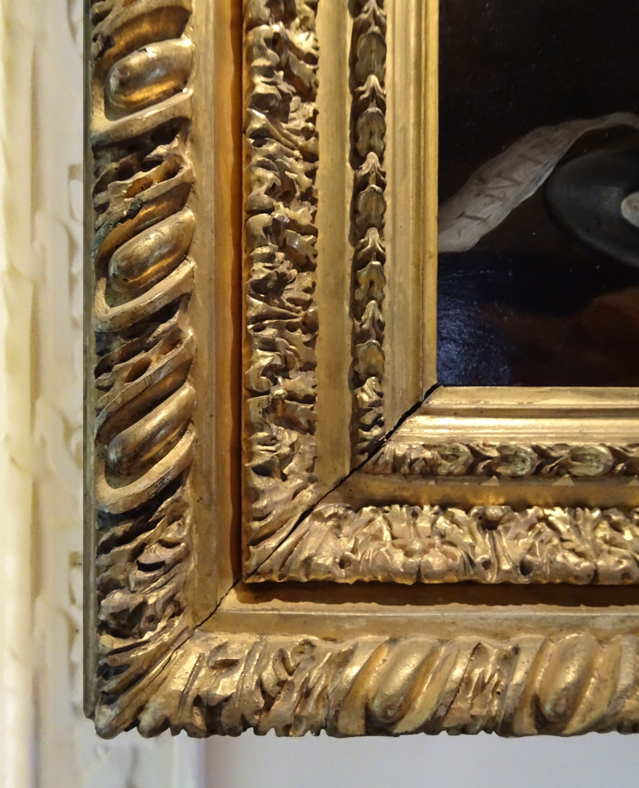For example, this small Louis XIII frame has not been altered or regilded; it retains all its original clarity, lightly patinated by time. It is carved in shallow relief but flowing naturalistic detail with acanthus and primula flowers – probably auriculas, for which there was a craze in the 17th  century – and might have been made for a flowerpiece, perhaps containing a simple pot of auriculas.  Peter Schade has suggested that it would also suit something like one of the small works by the Le Nain brothers, the gentle undulation of movement around the frame created by the curve of leaf and scroll acting as the perfect foil to the static sitters in their peasant scenes.