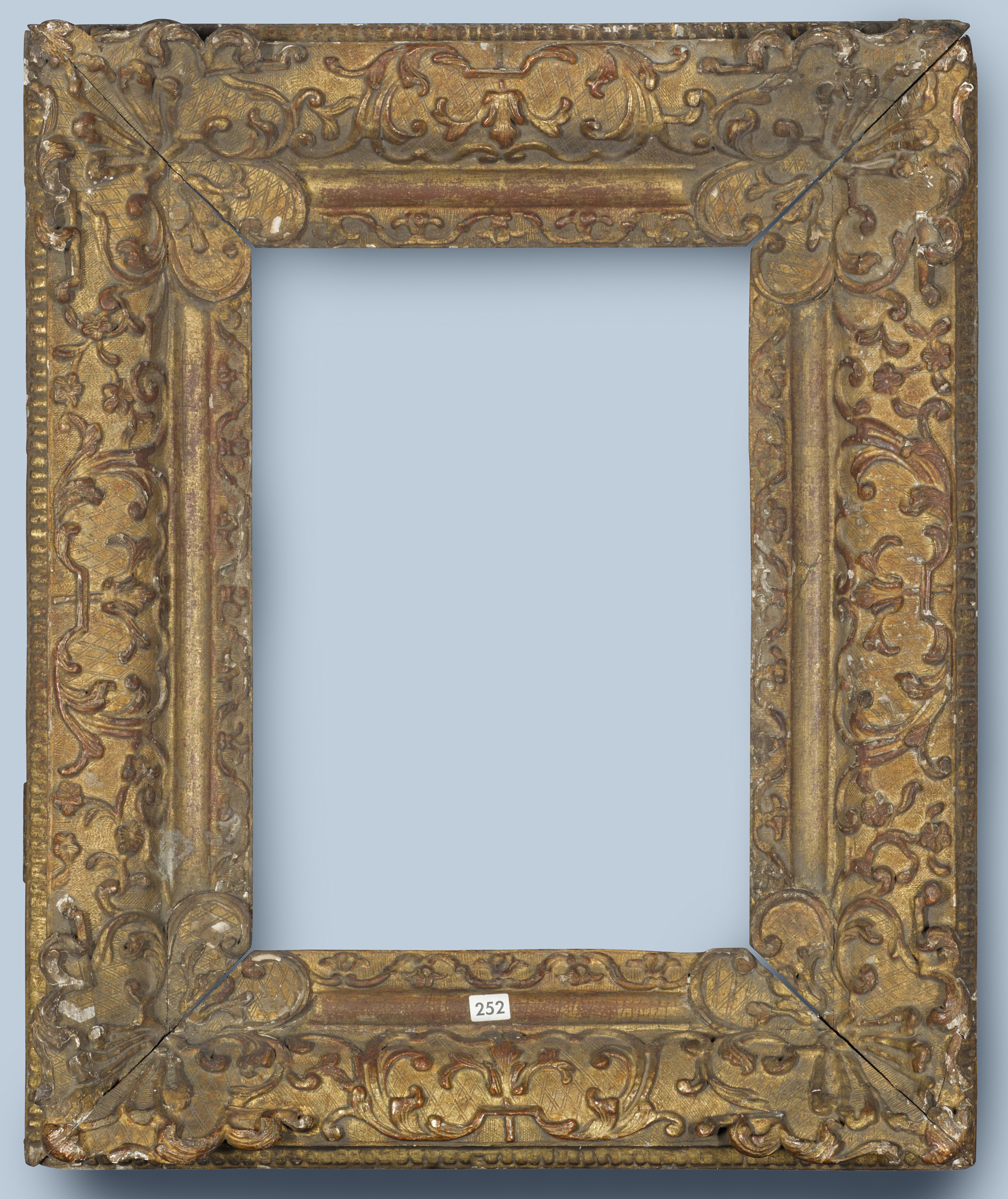 Lot 56: A fine provincial (southern) French Louis XIV-style carved giltwood frame, c. 1700, 97 x 143.5 cm.; made from poplar; convex profile; imbricated leaf at the back edge; delicate foliate C-scrolled decoration with leaf buds and floral sprigs on a cross-hatched ground; scrolling foliate projecting corners with leaves on a diapered ground; sanded frieze; panels of foliate ornament on the ogee at the sight edge; original gilding