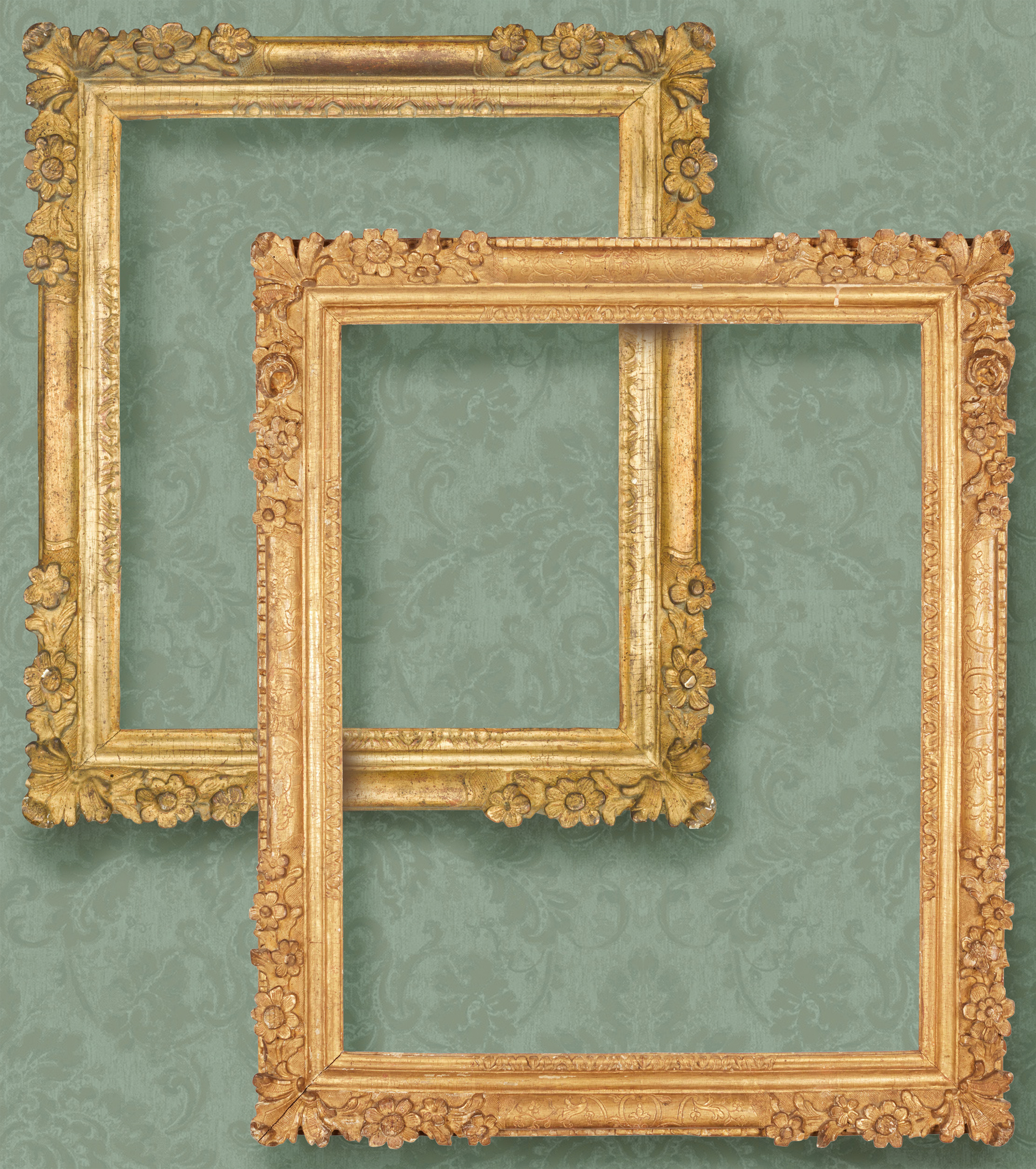 Lots 14 and 13: Louis XIII-XIV carved giltwood flower corner frames, convex profile, second half 17th century; Lot 14, 44 x 36 cm.; with foliated fanned lambrequin, sunflower and floretted corners; shaped reposes; cavetto; panels of acanthus tip at centres of sight edge; Lot 13, 80 x 63.4 cm.; with dentils at back edge; foliated fanned lambrequin corners, with sunflowers, narcissi, roses, violet and florets; shaped reposes incised with strapwork, leaf buds and rinceaux; cavetto; cavetto with centre panels  carved with acanthus leaf tip at sight edge; original gilding