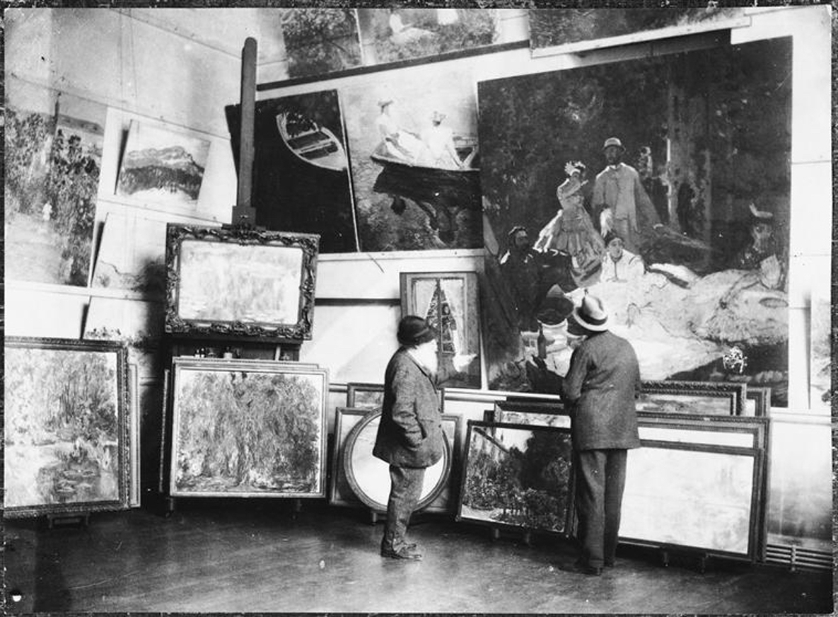 Monet in his studio with the duc de Trévise and frames, 1920 (collection RMN)