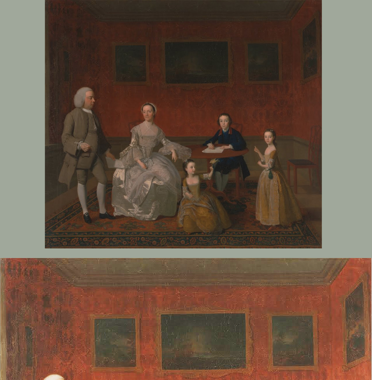 Arthur Devis (formerly attrib.; 1712-87), The Buckley-Boar Family, 1758-60, o/c, 98.4 x 110.5 cm., with detail of background paintings; Yale Center for British Art