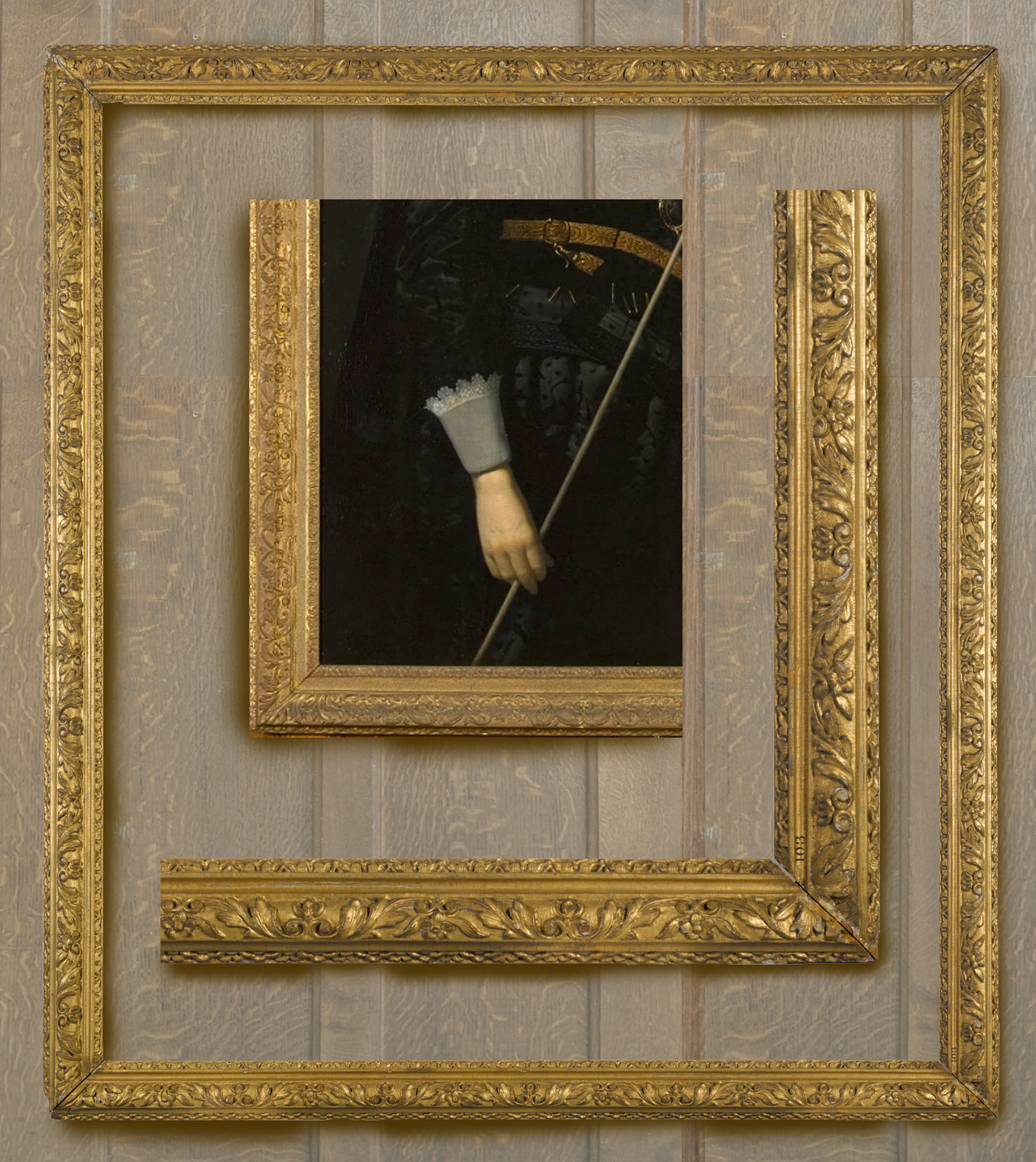 British Rococo frames are notable for their lightness and slender rails, as against the sculptural weight of French Rococo. They also retain the simple corners with foliate C-scrolls and rosettes which were elements of British Louis XIV-style frames, as here. In both Lot 103 and the frame of Hogarth’s portrait, the Rococo elements lie in the long borders of rocailles below the S-scrolls of the top edge, which encroach onto the frieze like small waves ebbing and flowing across the sand – the real sand, applied beneath the gilding – and the rocaille centres. The frame of the Hogarth has asymmetric centres, but Lot 103 is regular on both its axes.