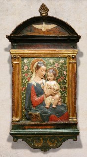 Rossellino workshop, Madonna & Child, 1460-75, polychrome stucco and moveable wooden frame, 79.06 cm. high, Currier Museum of Art