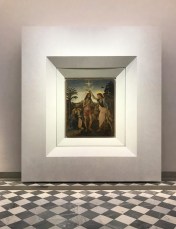 The shutters would have been marbled on the backs, rather than the fronts; this montage uses the frame of Van Eyck’s Man in a turban, with the marbled panels visible to give an impression of the work in 1700.