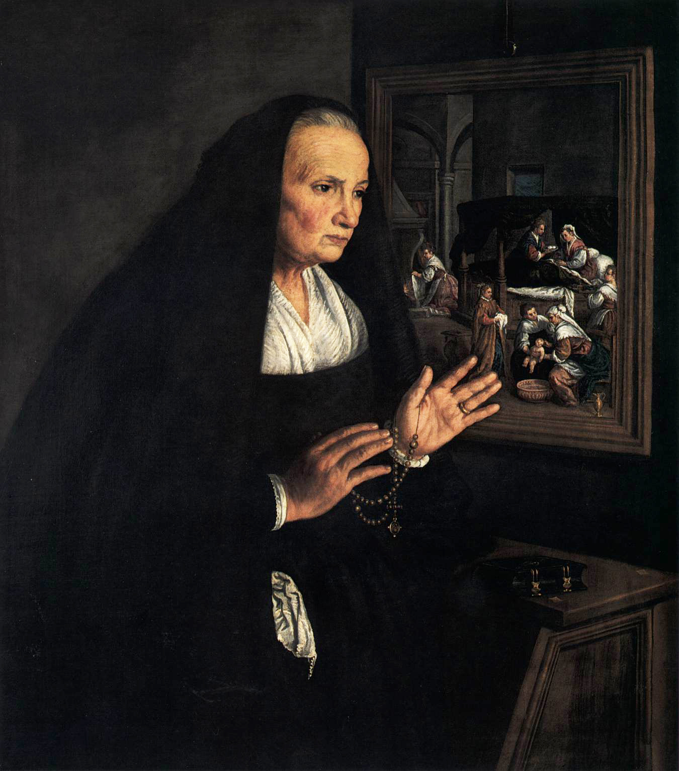 Leandro Bassano (1557-1622), Portrait of a widow at her devotions, first half 17th century, o/c, 105 x 88.5 cm., and detail, private collection