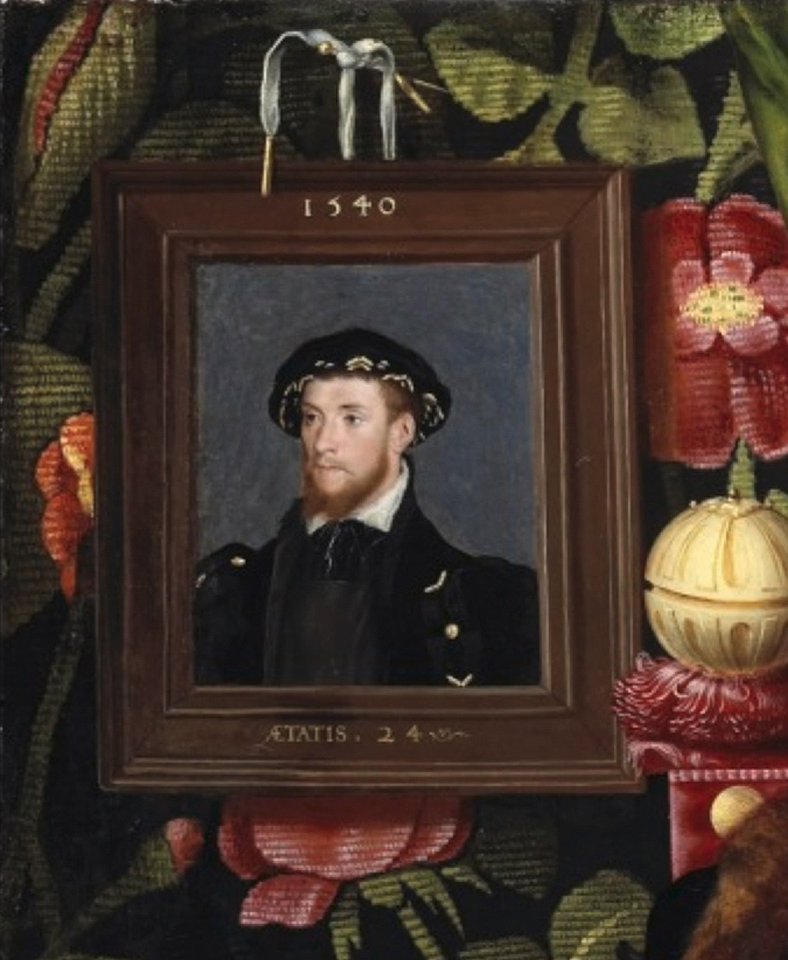 Here, therefore, is Lady Dacre with her first (executed) husband’s portrait in its stained, probably oak wood frame (just as though it were a photograph in a high street moulding), his age and the date inscribed on the frieze. Intriguingly, it hangs by what looks like a white shoelace – but is probably a lace for some other part of Lady Dacre’s clothing – from a large pin driven into the tapestry of damask roses in the background. The accuracy of all the detail in the painting – the blackwork collar and cuffs, the fur, posy and texture of the tapestry – are so convincing that the carefully-painted mouldings of Dacre’s frame and its informal hanger must be equally true to life. Perhaps the hanger indicates that the portrait always travelled with her, from her study to her bedchamber as well as to other houses she visited.