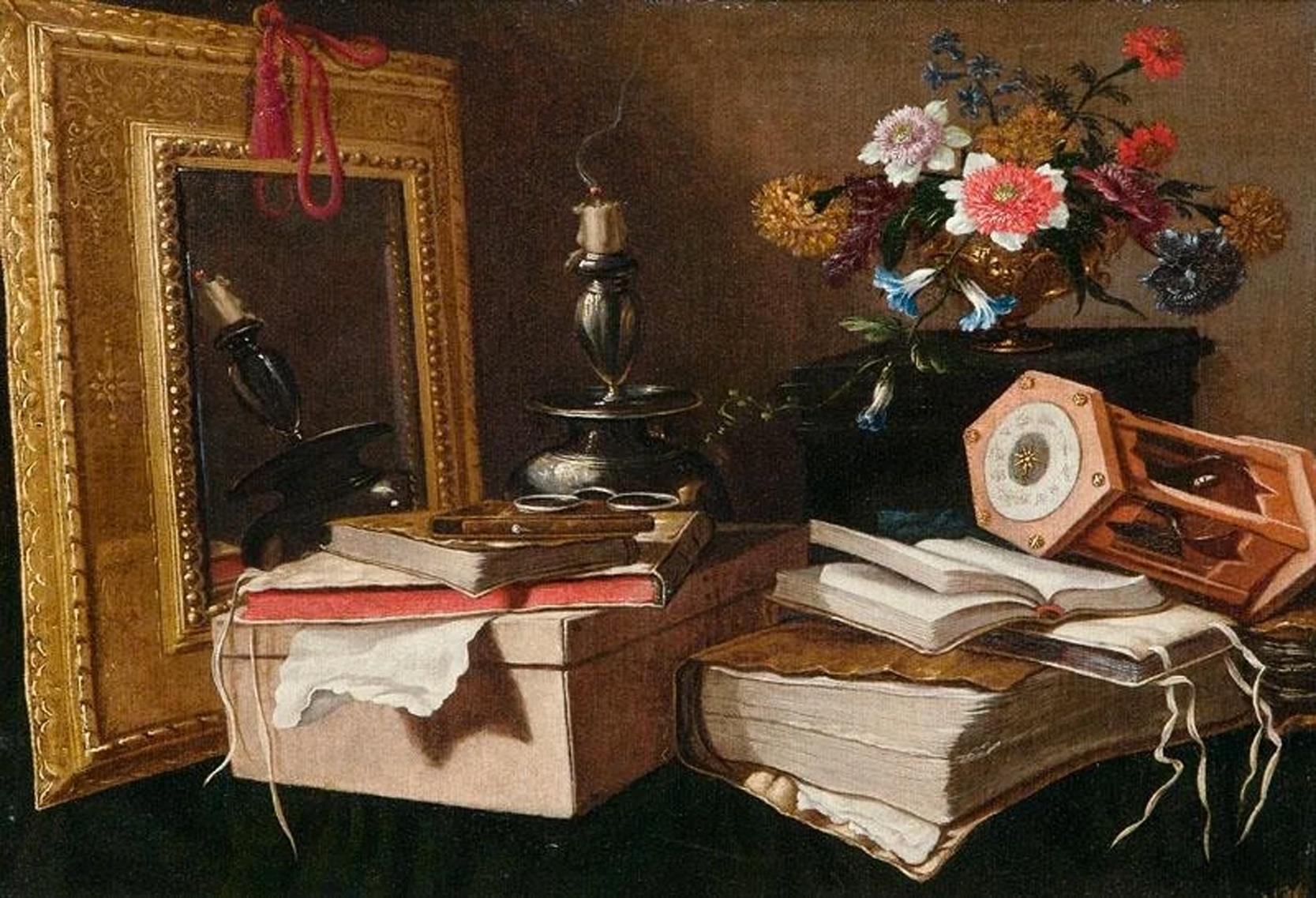 Master of the Vanitas Texts (fl. Madrid c.1650), Vanitas with a looking-glass, candle, hourglass, &c., o/c, 49 x 65.5 cm., Sotheby’s, 4 July 2013, Lot 225