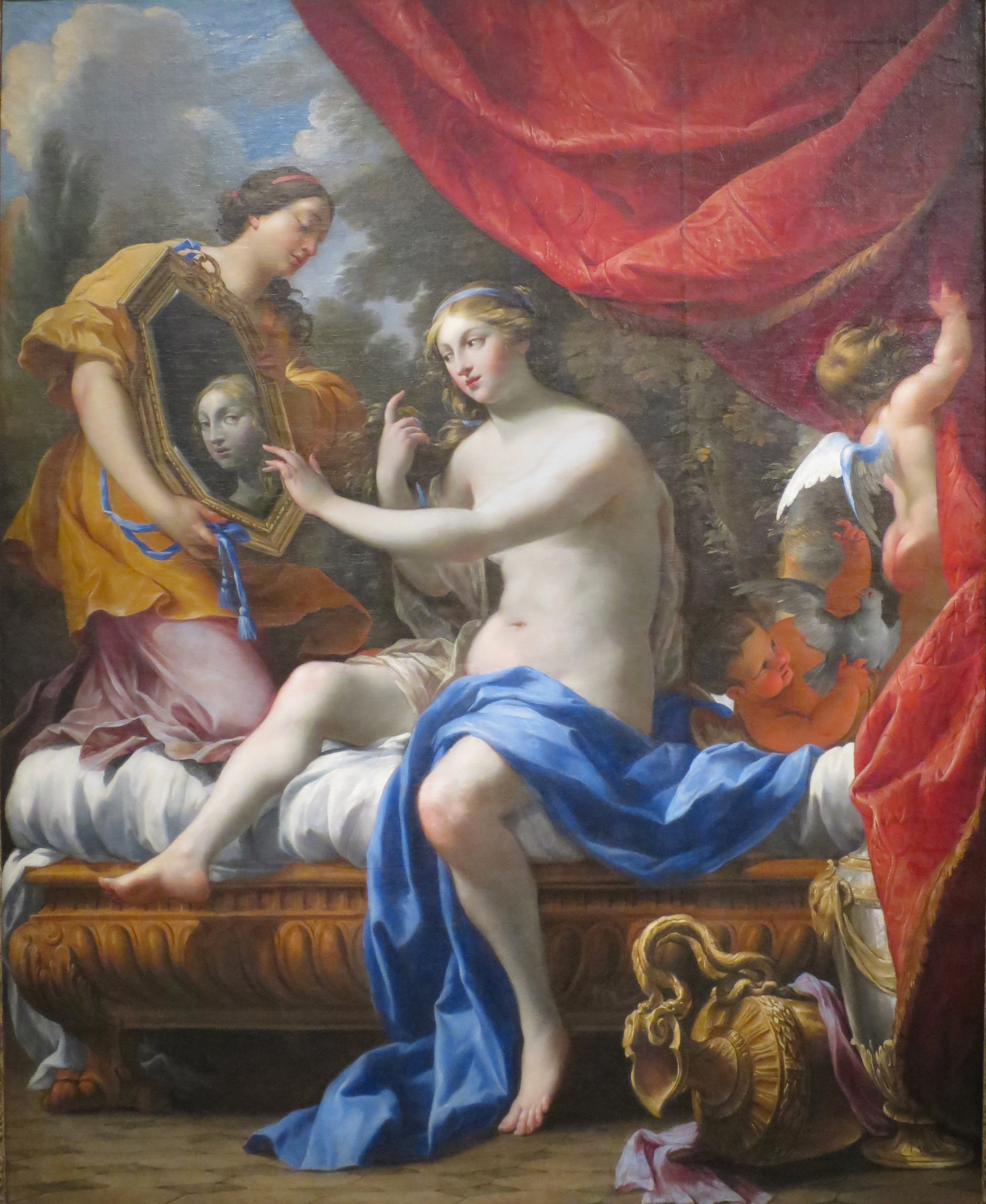 Painting might equally well immortalize beauty as a produce a sermon against valuing it. Simon Vouet’s Venus at her toilet has two very nice looking-glasses in which to admire herself; one has an octagonal frame with a stepped ogee profile, a carved astragal-&-double bead, and an animal’s head at the top (is that a subtle warning, however? – the ape of folly or the goat of lust?).