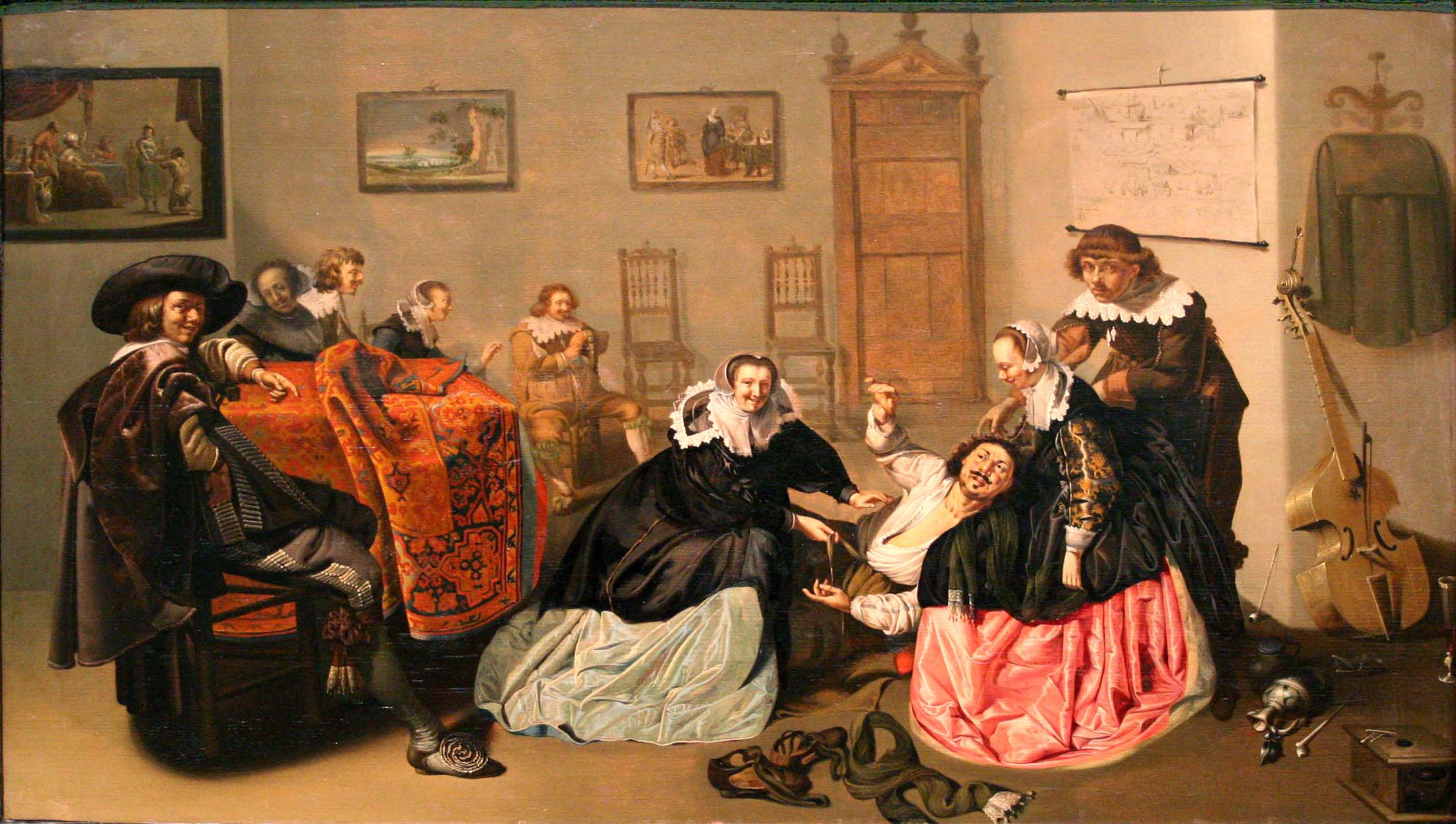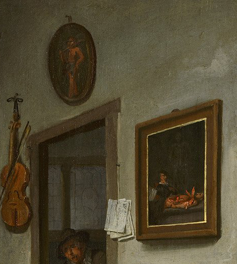 The Baroque art of the Low Countries is where by far the most numerous depictions of framed paintings hanging in interiors are to be found. There seem to be hardly any rooms, unless in the poorest houses and taverns, where there are no paintings, maps or engravings; and many middle-class, mercantile houses appear to have almost as large a collection as those of the gentry and nobles. The frames also seem mostly to be drawn very accurately, which is why this section starts with the dismissal of David Teniers the younger.