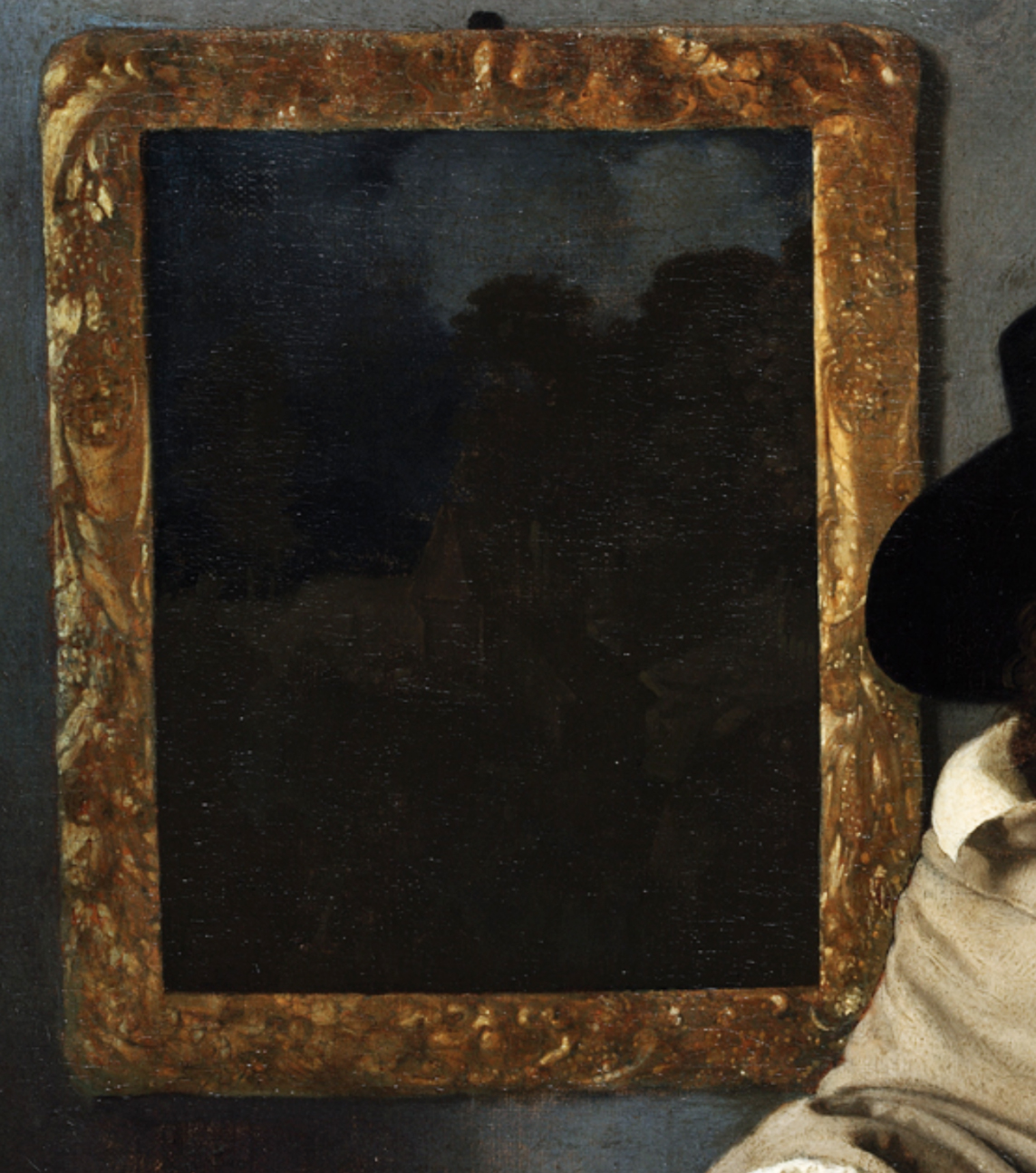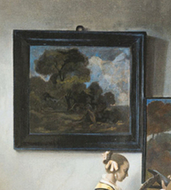 More fashionably, Vermeer’s guitarist sits beneath a landscape in a (probably French) Louis XIII frame.