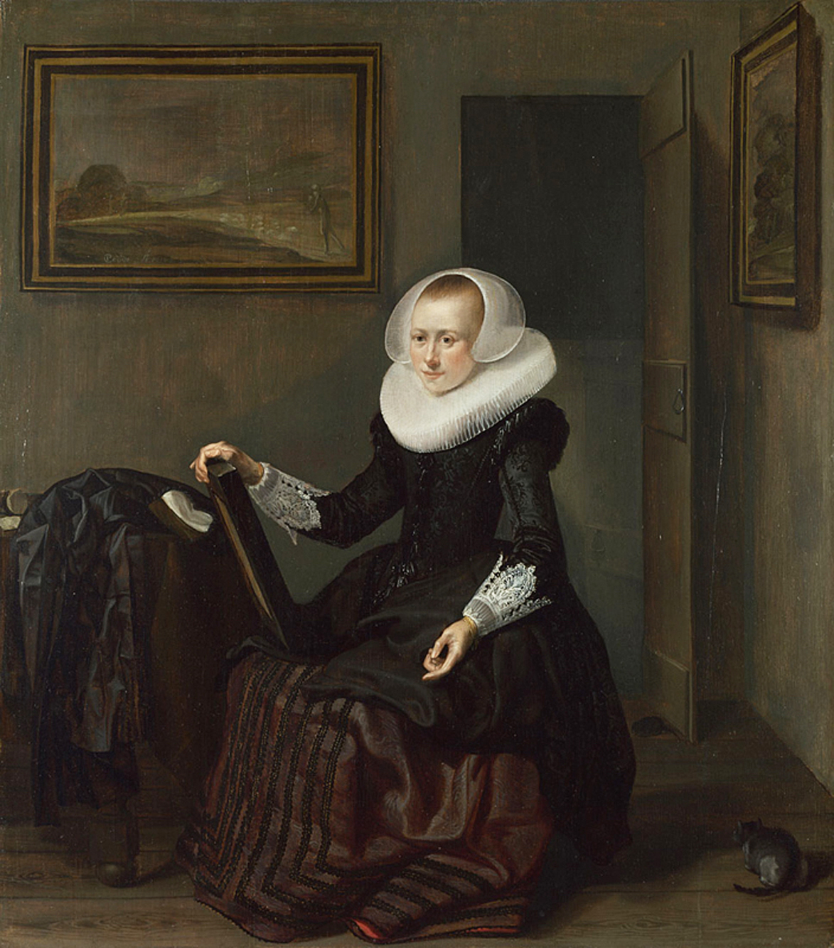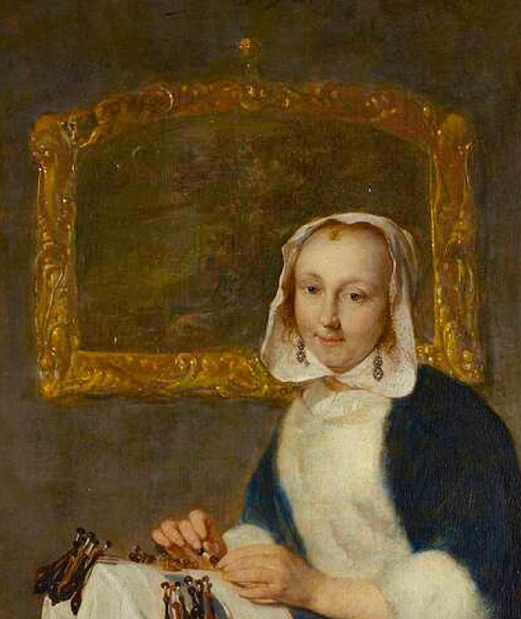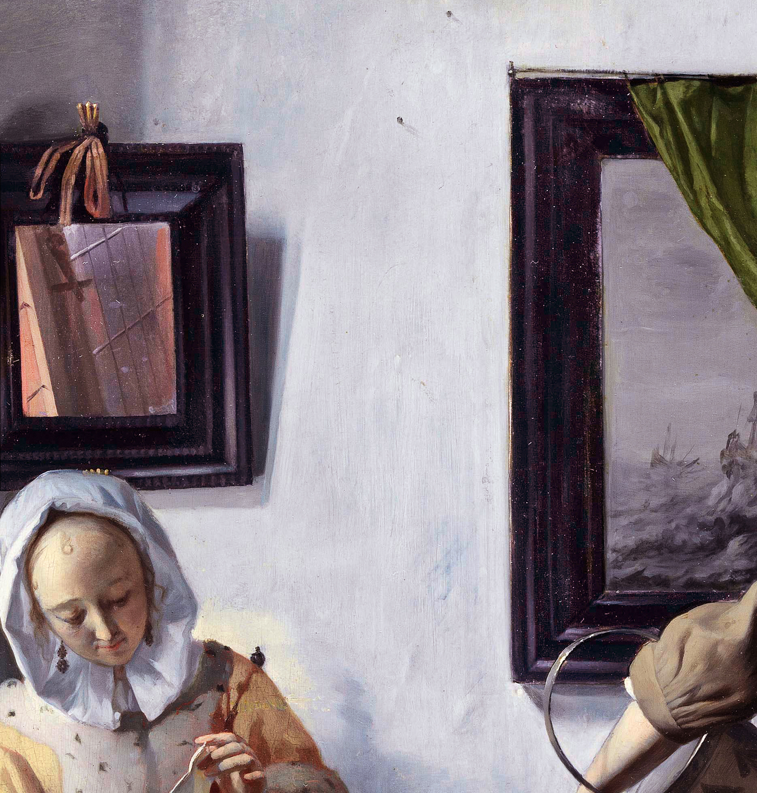 Another fruitwood frame, or perhaps a frame veneered with panels of figured wood and parcel-gilt, holds a portrait next to two ebony-framed landscapes. Light picks it out; perhaps the sitter is the writer of the letter, the husband of the reader and provider of the rich carpet and the satin gown, but also a man for whom a frame of golden wood is symbolically enough.