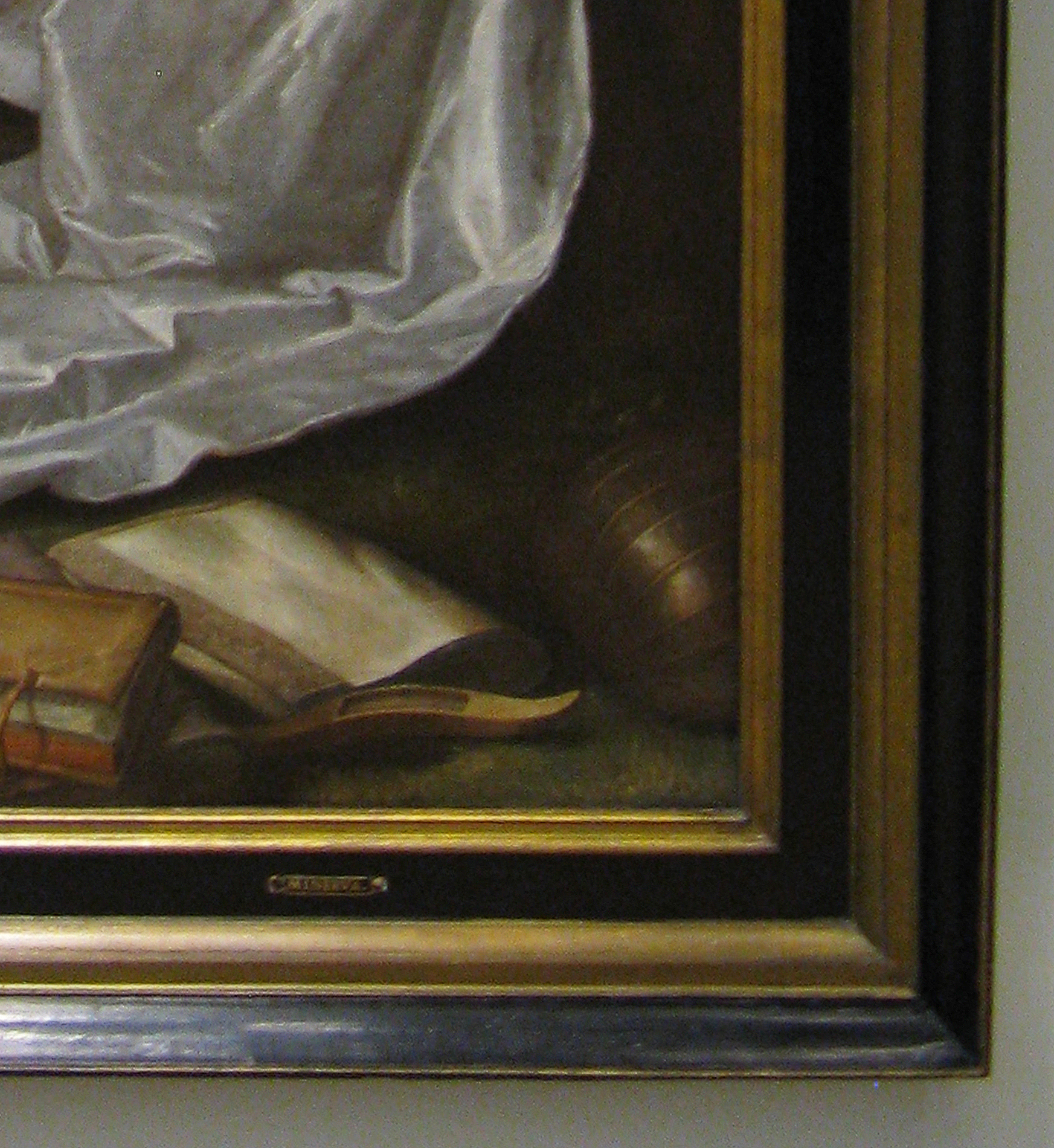 This intriguingly detailed depiction of a picture gallery, exploring the collaboration of art and mathematics through the relationship of painting and drawing, contains so many accurately represented objects that it is impossible not to give the frames of the paintings as much credence as the various scientific instruments – especially the frames hanging nearer the two red damask-covered tables. Even if they aren’t pictures of actual framed paintings, they are so realistic that they at least bear witness to there being frames exactly like this, at that time.