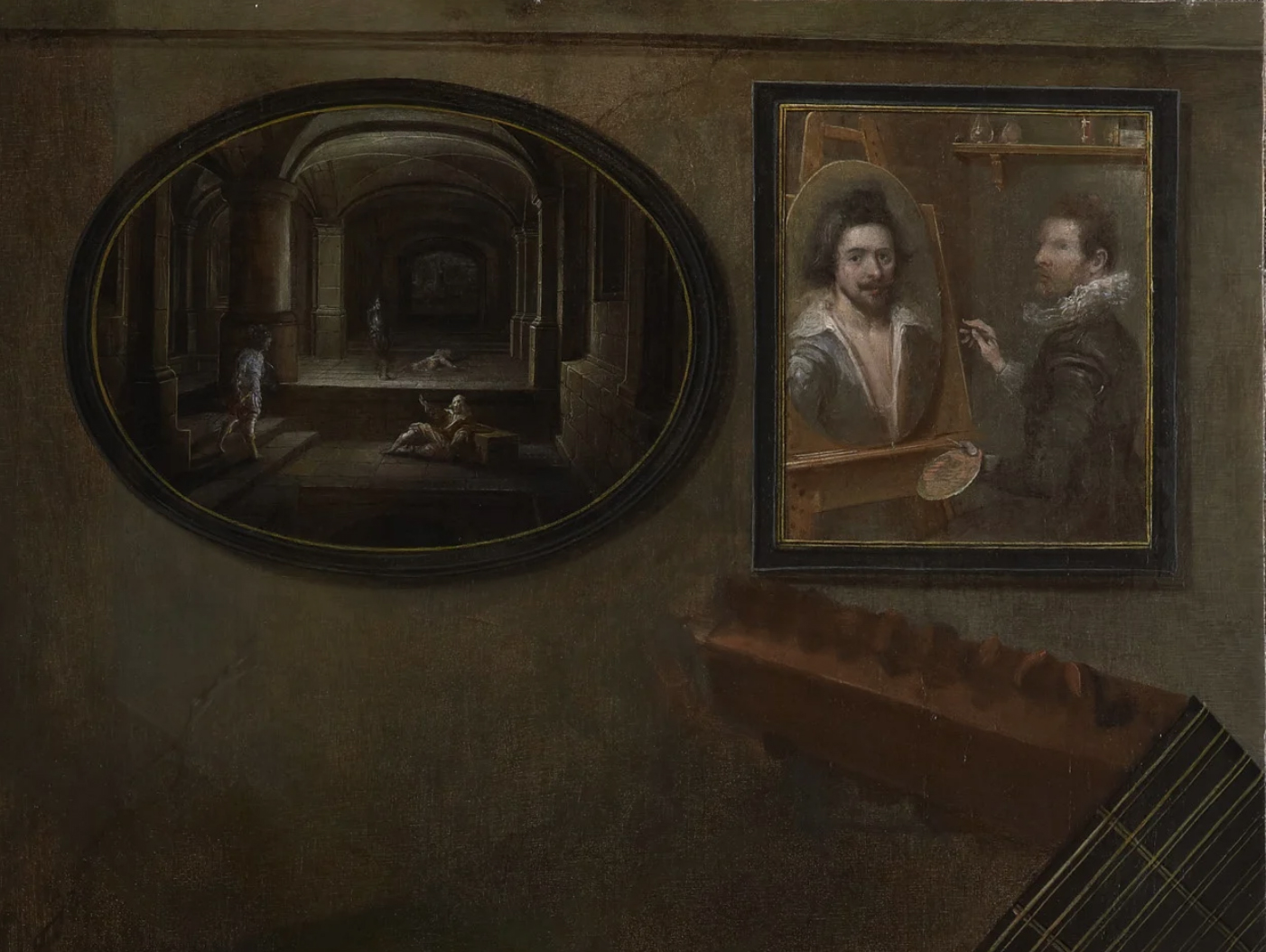 This portrait came onto the market a year ago, in October 2023, and is particularly interesting for the combination of frame and painting presented to the viewer. It is assumed to be the portrait of Jean Pointel, one of Poussin’s patrons; the painting shows a slightly inaccurate piece of Poussin’s Landscape with ruins (1642) in the Prado , apparently owned by Pointel before it found its way into the Carlo Maratti collection in Rome, and thence to Philip V of Spain; but – more importantly – he (or Poussin) has framed it, not in one of the perfectly plain and undecorated Roman gallery frames which are stacked in the background of Poussin’s self-portrait in the Louvre, but in a contemporary Louis XIII convex frame carved with acanthus leaves and a spiral ribbon at the sight edge.