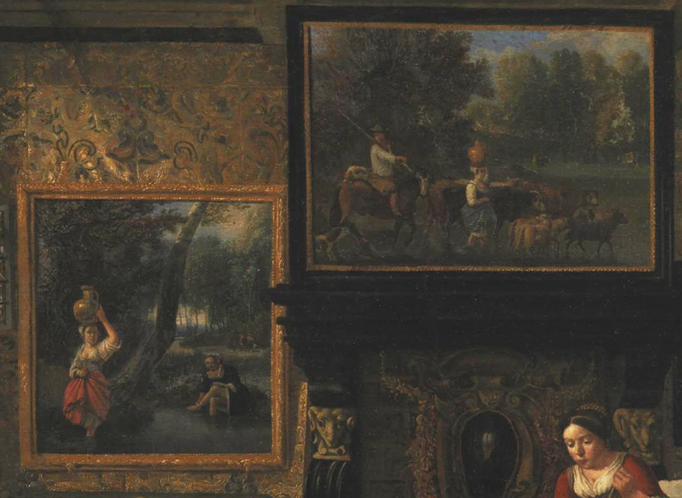 The Woman reading a letter does so in a room furnished with ebony frames and chair, and a painting of ships on a stormy sea (revealed by her maid drawing back its curtain, as she reads); her lover or husband writes in front of a peaceful family of goats in a landscape from which the clouds are clearing. And the frame is a beautifully carved Auricular design, laden with swags of bay leaves and fruit, with one of Venus’s doves nesting happily at the crest.