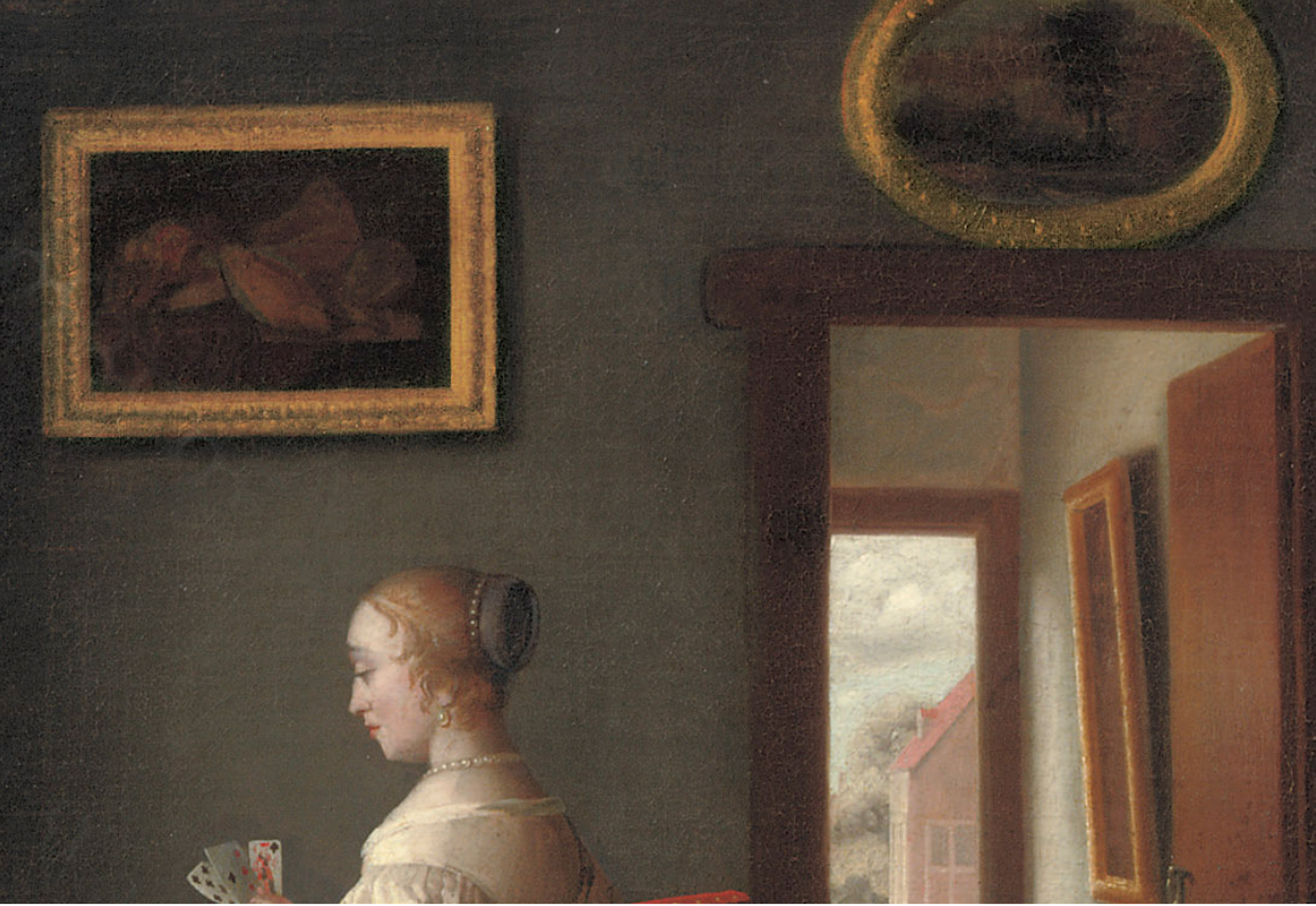 Samuel van Hoogstraten (1627-78), An elegant couple playing cards, o/c, 65.3 x 77.8 cm., and detail, Christie’s, 13 October 2009, Lot 64