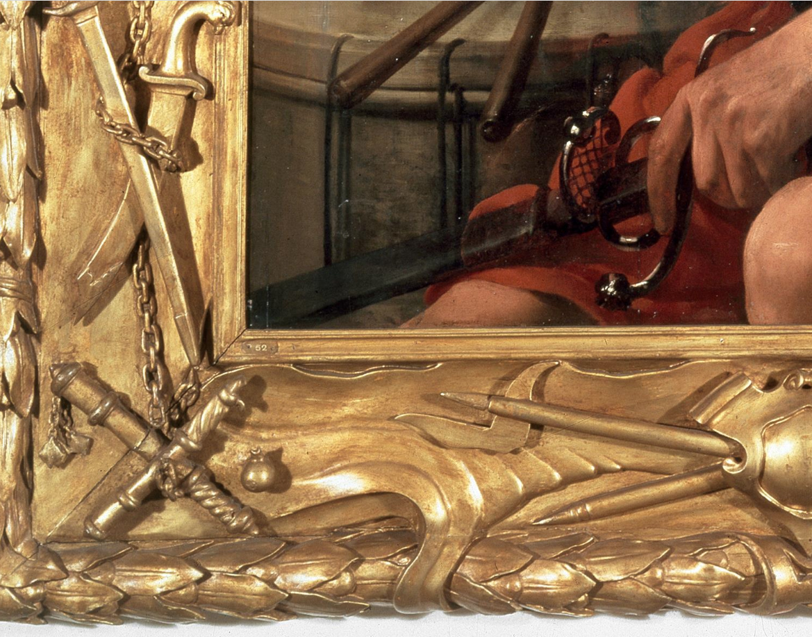 The models for the frame seems to be Italian trophy frames or frames influenced by them, such as the reverse cassetta with military trophies which had been given to Hendrick ter Brugghen’s Sleeping Mars in 1650. This reframing appears to have happened when, as noted above, the Mars entered the collection of an artist, Martin Kretzer of Amsterdam, whose collection was publicized – also in 1650 – in a poem by Lambert van den Bos.