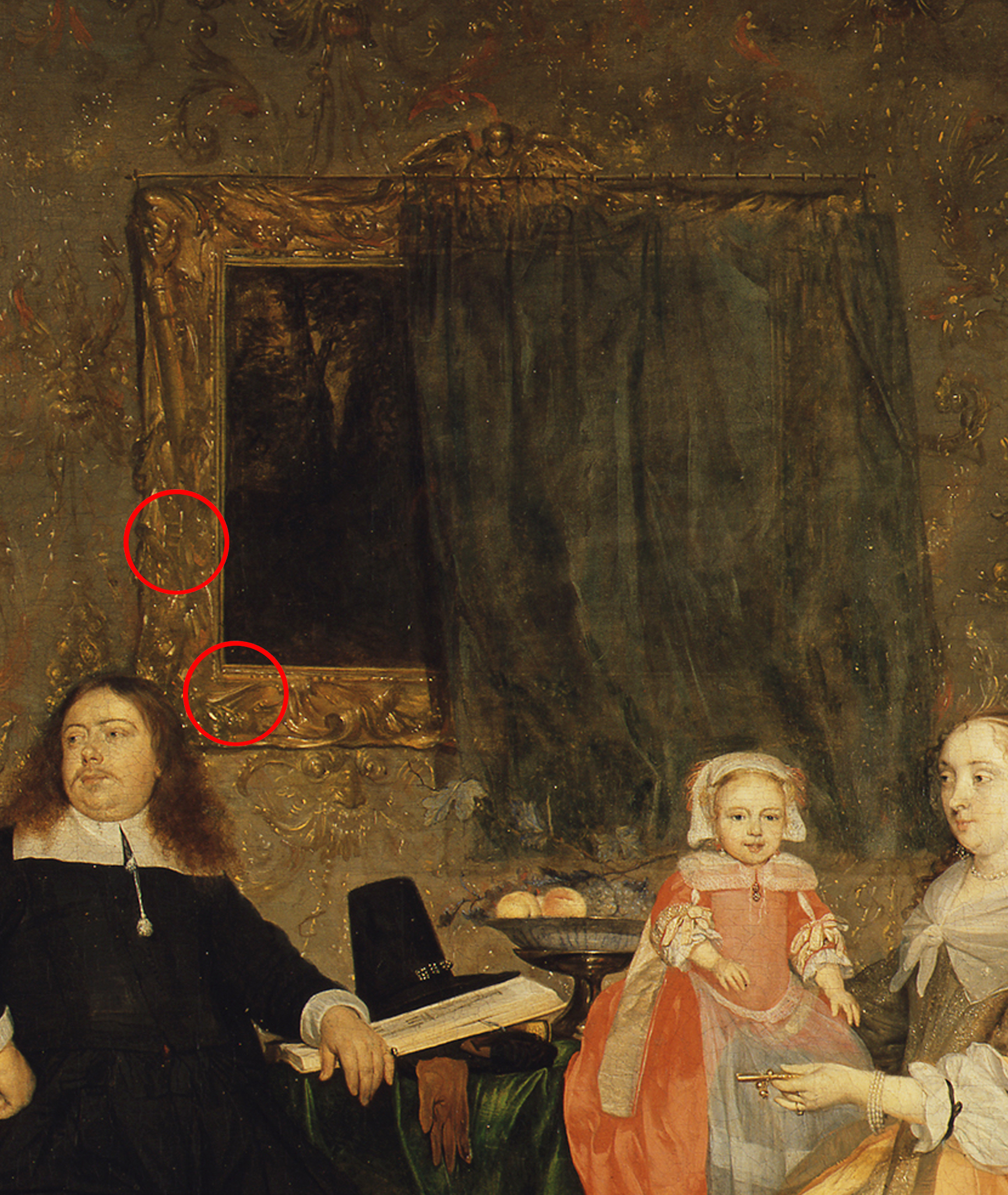 The Auricular frame in Metsu’s portrait of the Hinlopen family may be doing something else again. It’s another massive piece of gilded sculpture, in the centre of the wall, and has a green silk curtain on a brass rail half-concealing it and its painting. The latter seems to be a landscape from what can be seen of it; but what if it is more than that?