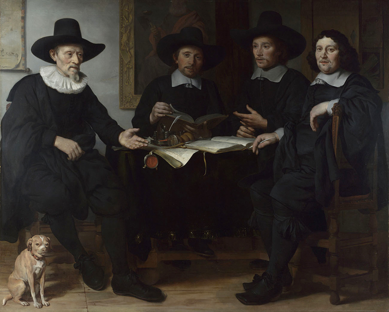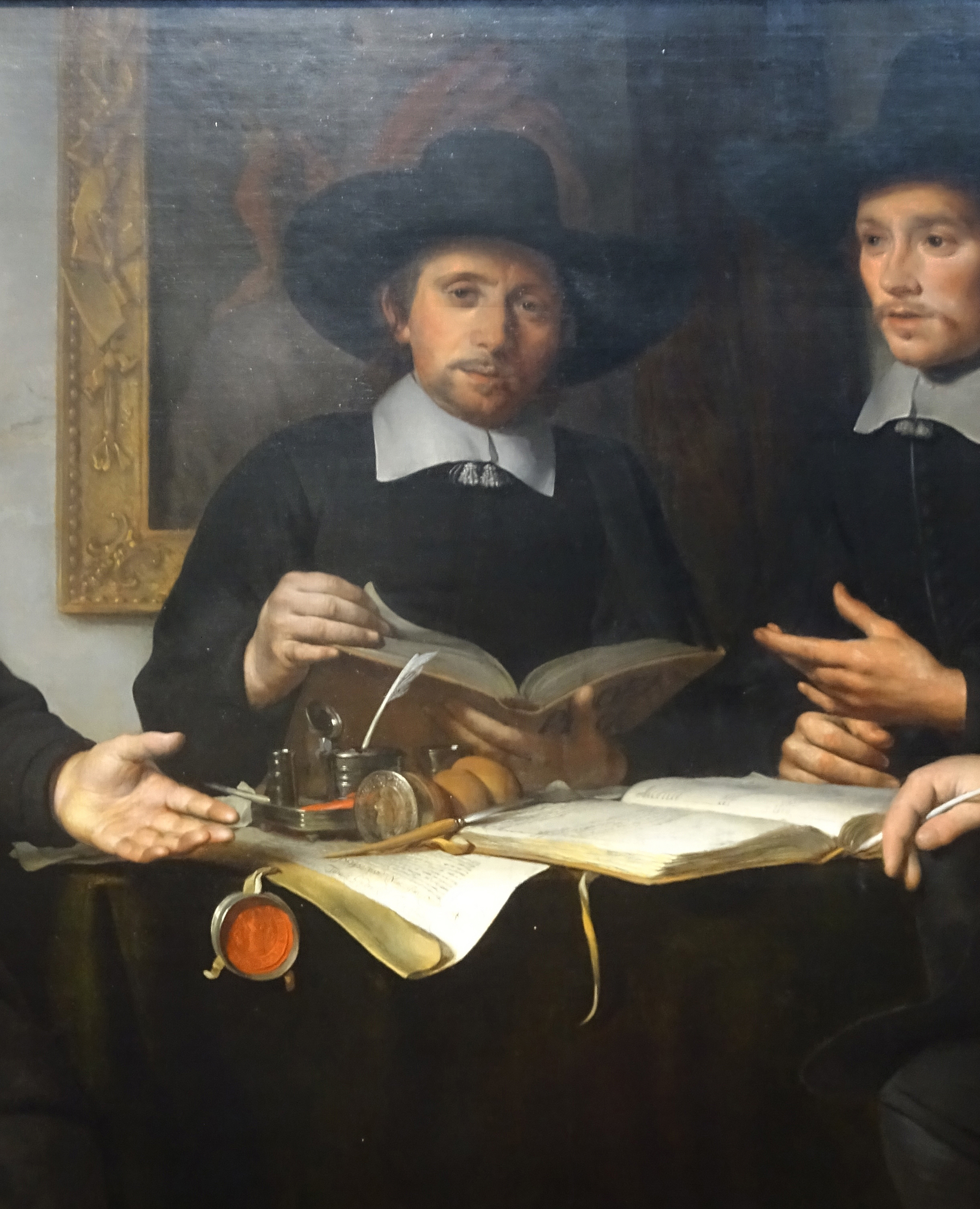 Gerbrand van den Eeckhout (1621-74), Four officers of the Amsterdam Coopers’ & Wine-rackers’ Guild, 1657, o/c, 163 × 197 cm., and detail, National Gallery