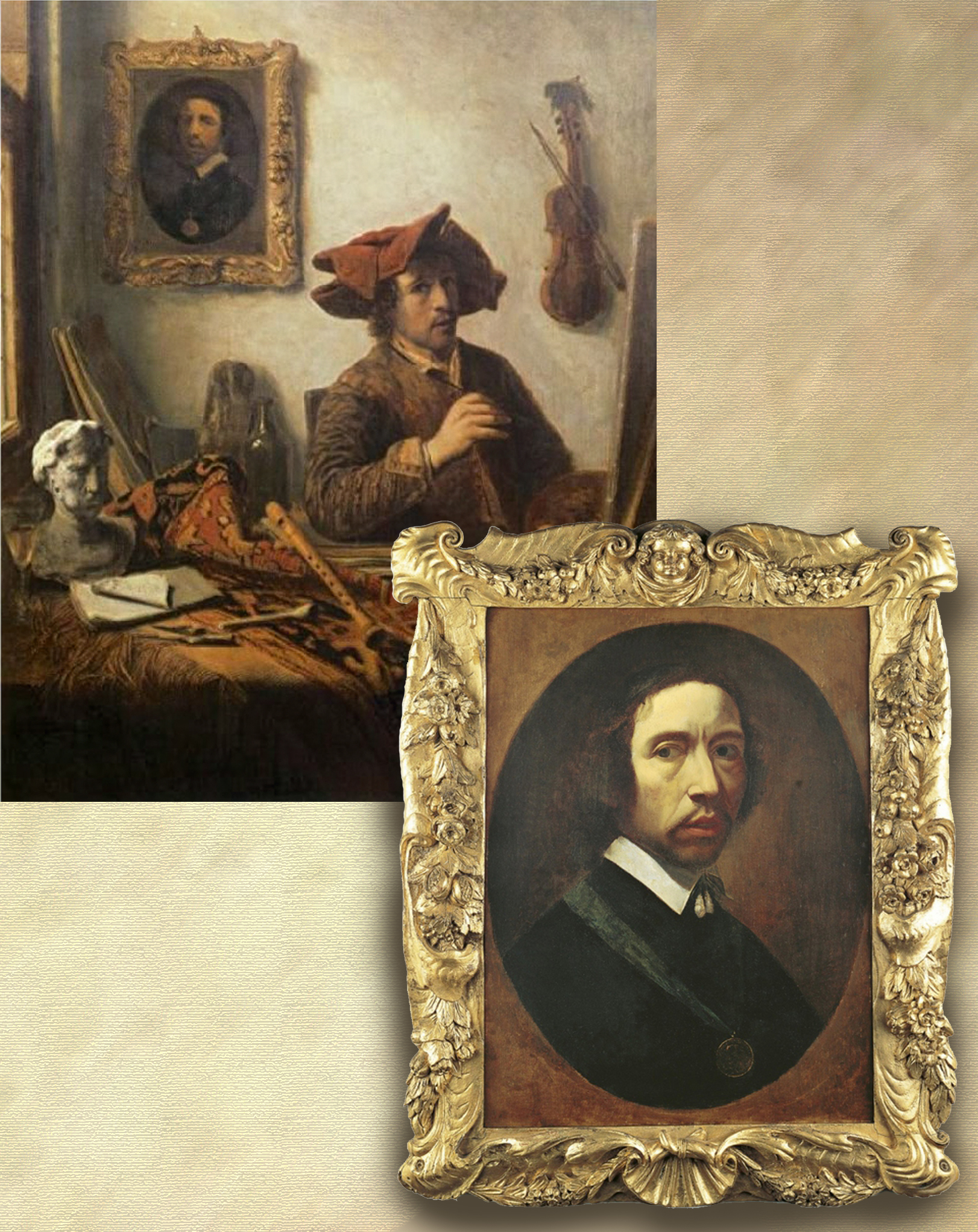 Oval versions of Louis XIII frames also proliferated, usually for portraits – but here the collector Filip de Flines is portrayed against a background containing the fabrics he dealt in, and which have paid for his marble walls, modish kimono, and decorative oval landscapes in imbricated bay leaf garland frames.