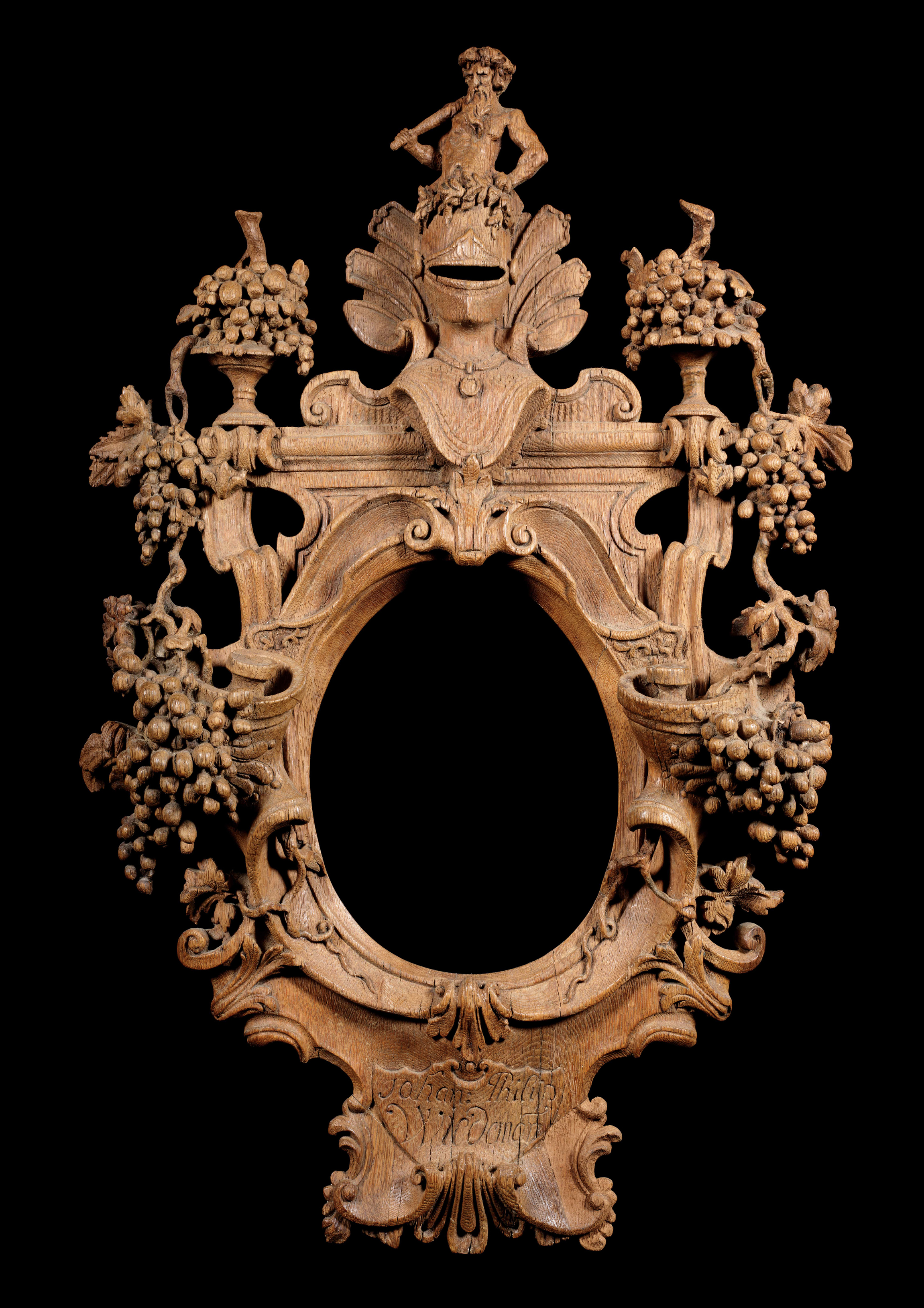 Lot 3: a Northern Mannerist carved and pierced oak frame from the South Netherlands or Germany; c.1680; with an armorial crest of a wild man mounted on a helmet displayed against a giant fanned lambrequin, with festoons of bunches of grapes and vine leaves cascading on either side from plinths at the upper corners, the apron inscribed ‘Johan Philip Wildeman’; 65 x 43 cm.; estimate: €3,000-5,000