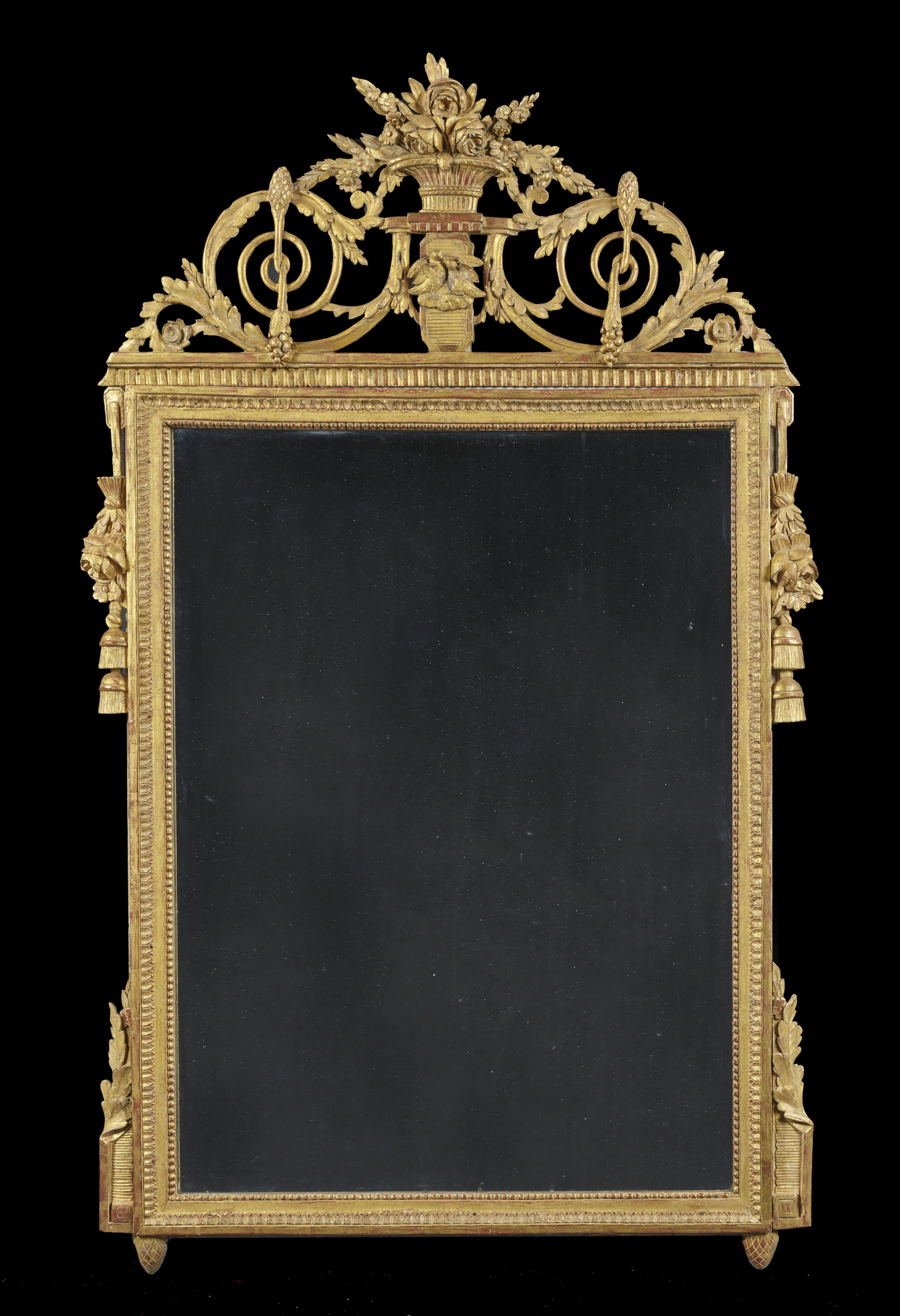 Lot 318: a French Louis XVI carved giltwood looking-glass with fronton; all four rails with an architrave profile, with rais-de-coeur below the top edge and beading at the sight edge; supporting a fluted frieze and cornice moulding, above which are giant but slender pierced scrolling foliated volutes ending in tied pine cones and berries, and holding a plinth with two courting doves, above which is a basket of flowers and foliage; beneath the cornice on each side a swag of flowers and tassels depends on a ribbon threaded through an illusionary hole; outset fluted corners at the base spring acanthus leaves, whilst pine cones depend from the bottom rail; with a later mirrored plate; 159 x 96 cm.; estimate: €2,000-3,000