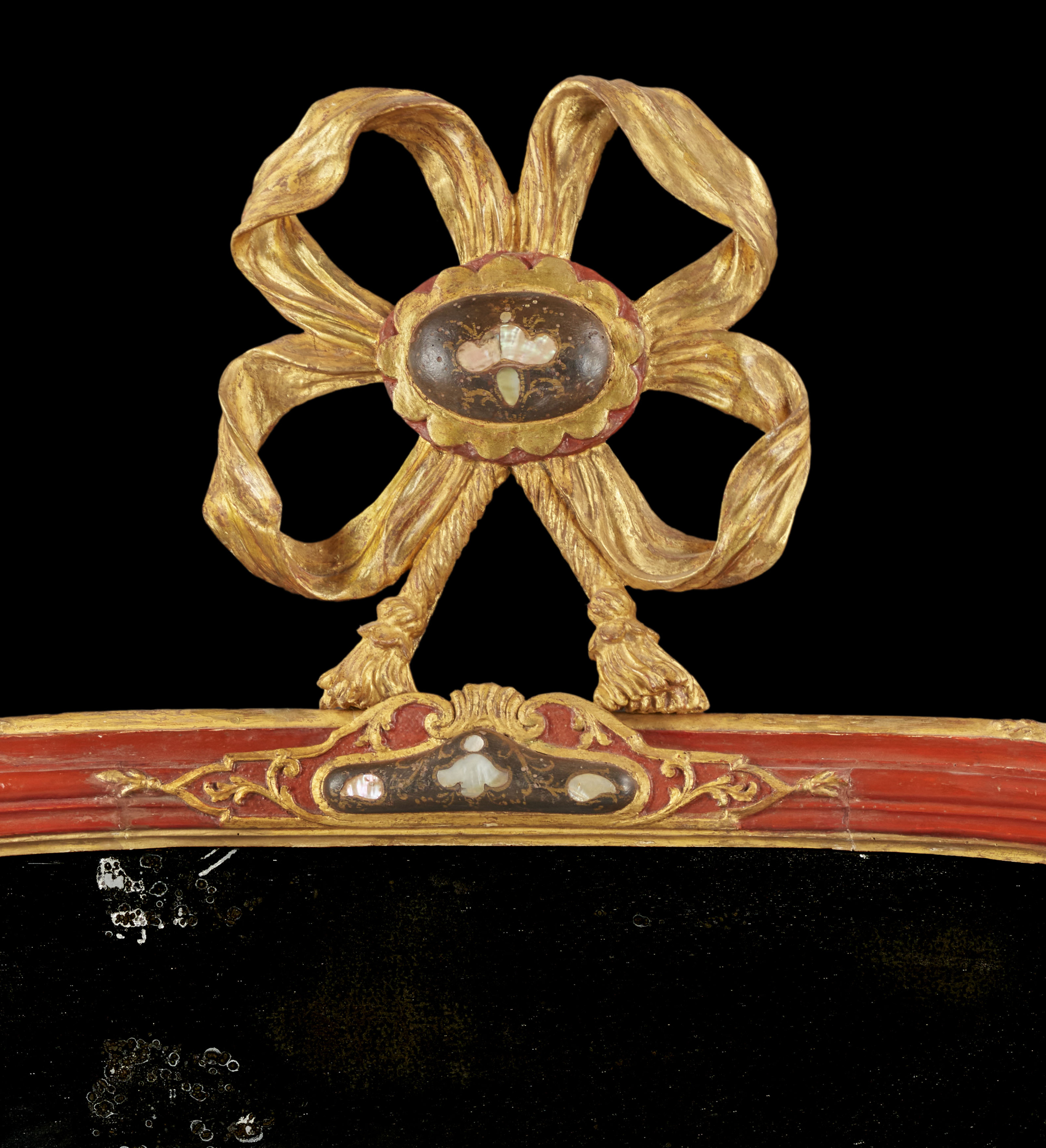 Lot 340: an 18th century Venetian Rococo carved parcel-gilt and red lacquered looking-glass in landscape orientation; stepped convex and ogee moulding, with gilded back edge holding black decorative panels between sprigs of gilt leaves; the top edge with shaped black panels at the centres decorated with gold rinceaux and inlaid with mother-o’-pearl flowers and leaves, and held in slender foliated strapwork-&-shell ornament; the whole depending from a carved giltwood trompe l’oeil bow of ribbon with two tassels, the knot of the bow with a sunflower on a red ground, its centre with a matching black cabochon decorated with gold rinceaux and inlaid with a mother-o’-pearl flower; 123 x 131 cm.; estimate: €3,000-5,000