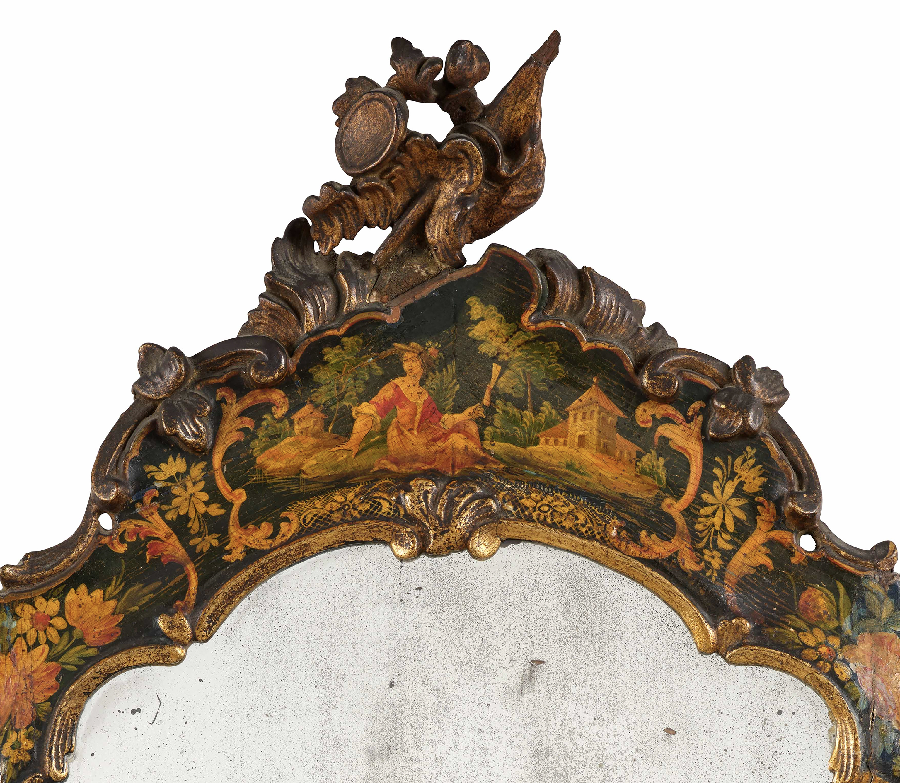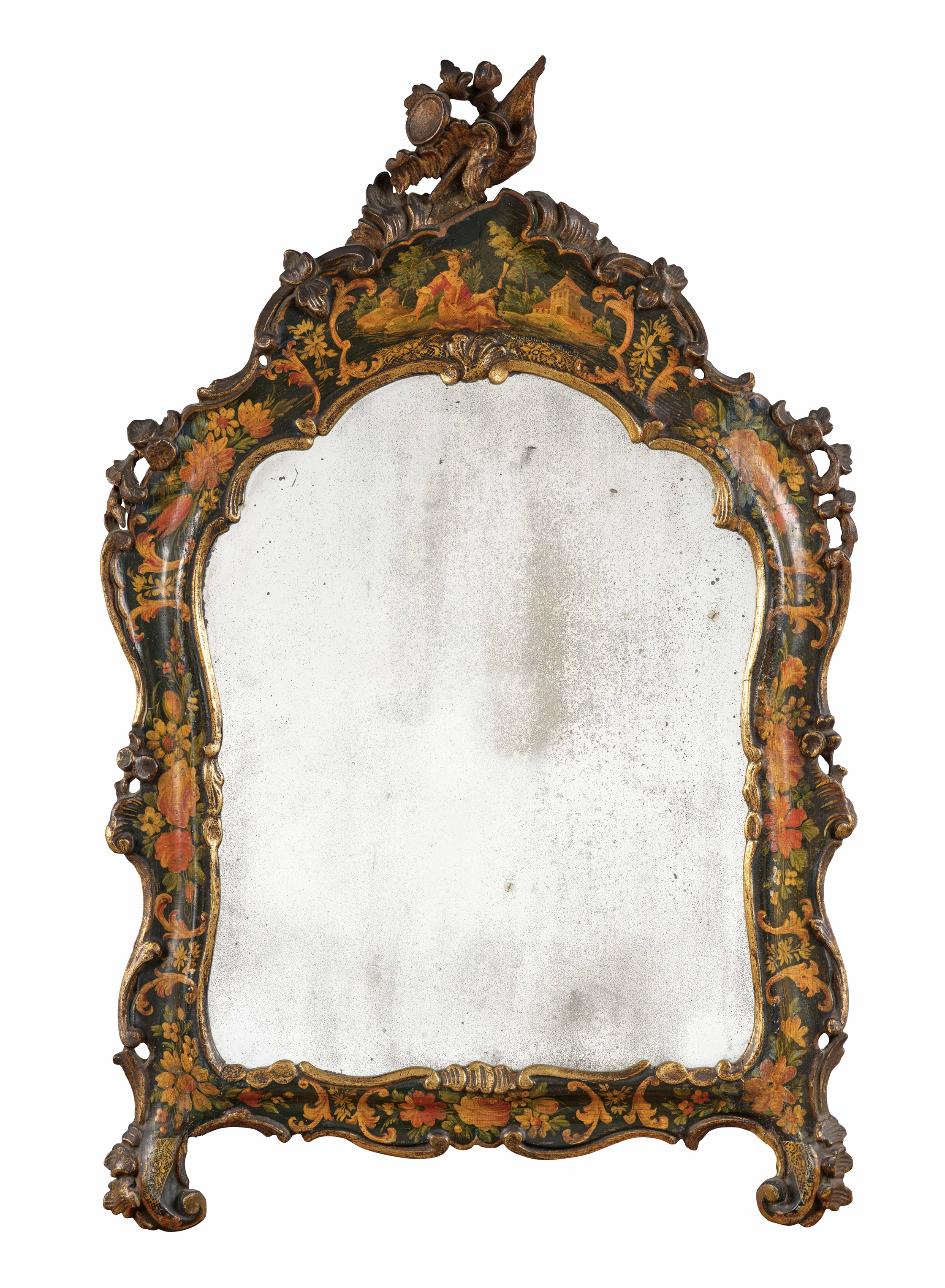 Lot 366: a mid-18th century Venetian carved, pierced, parcel-gilt and polychrome looking-glass; a serpentine contour with a cushion profile held between slender S- and C- scrolling gilded mouldings, with small flowered drops and rocailles on the back edge; the cushion moulding lacquered with a dark brown ground, and painted with centred arrangements of flowers and leaves in green, yellow and red, with the asymmetric top panel holding a pastoral scene with a shepherdess spinning, beneath the crest of a shell, leaves and a rocaille; the base ends in two scrolled ‘feet’ decorated with painted gold flowers on a cross-hatched ground; 71 x 46 cm.; estimate: €4,000-6,000
