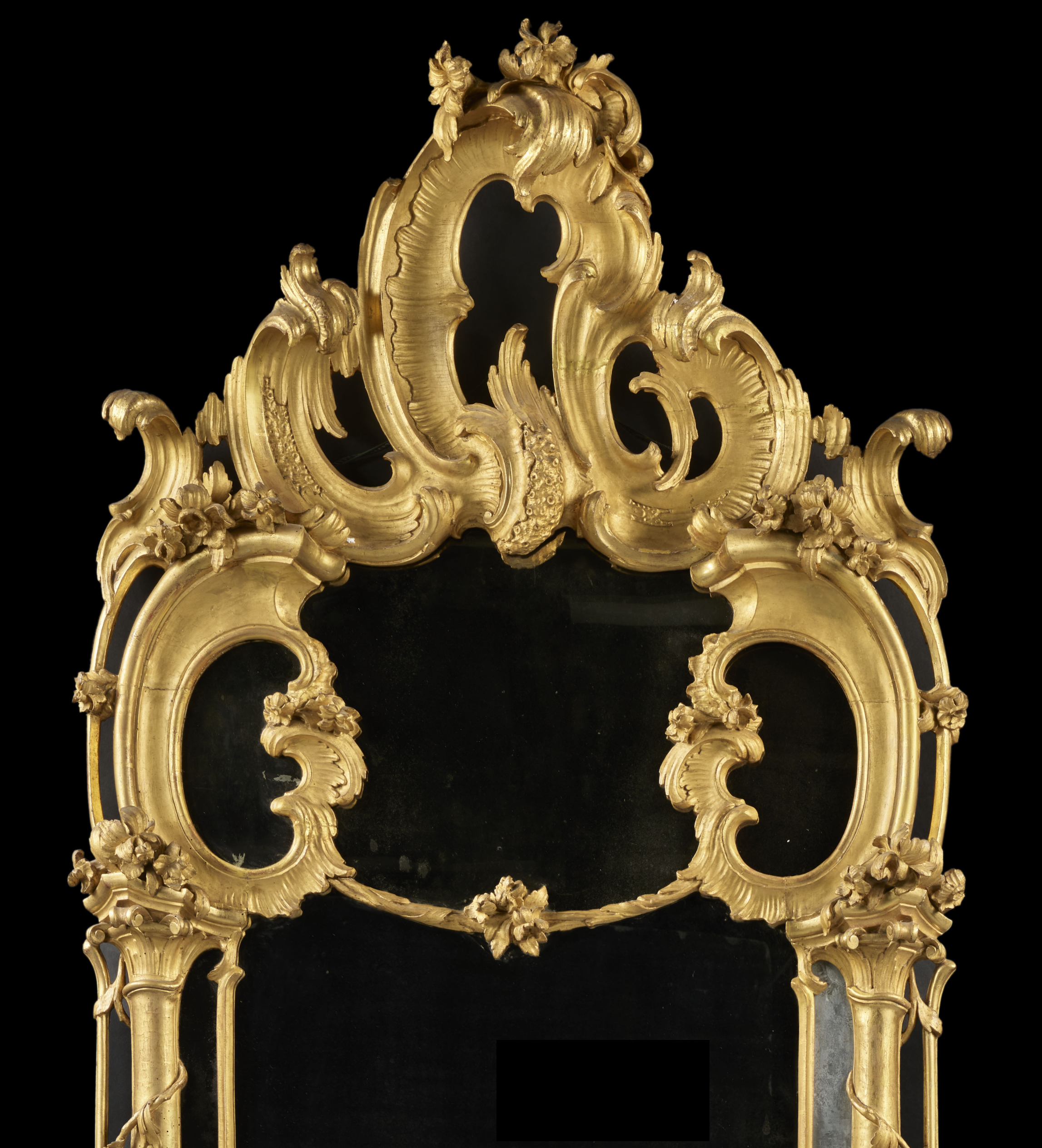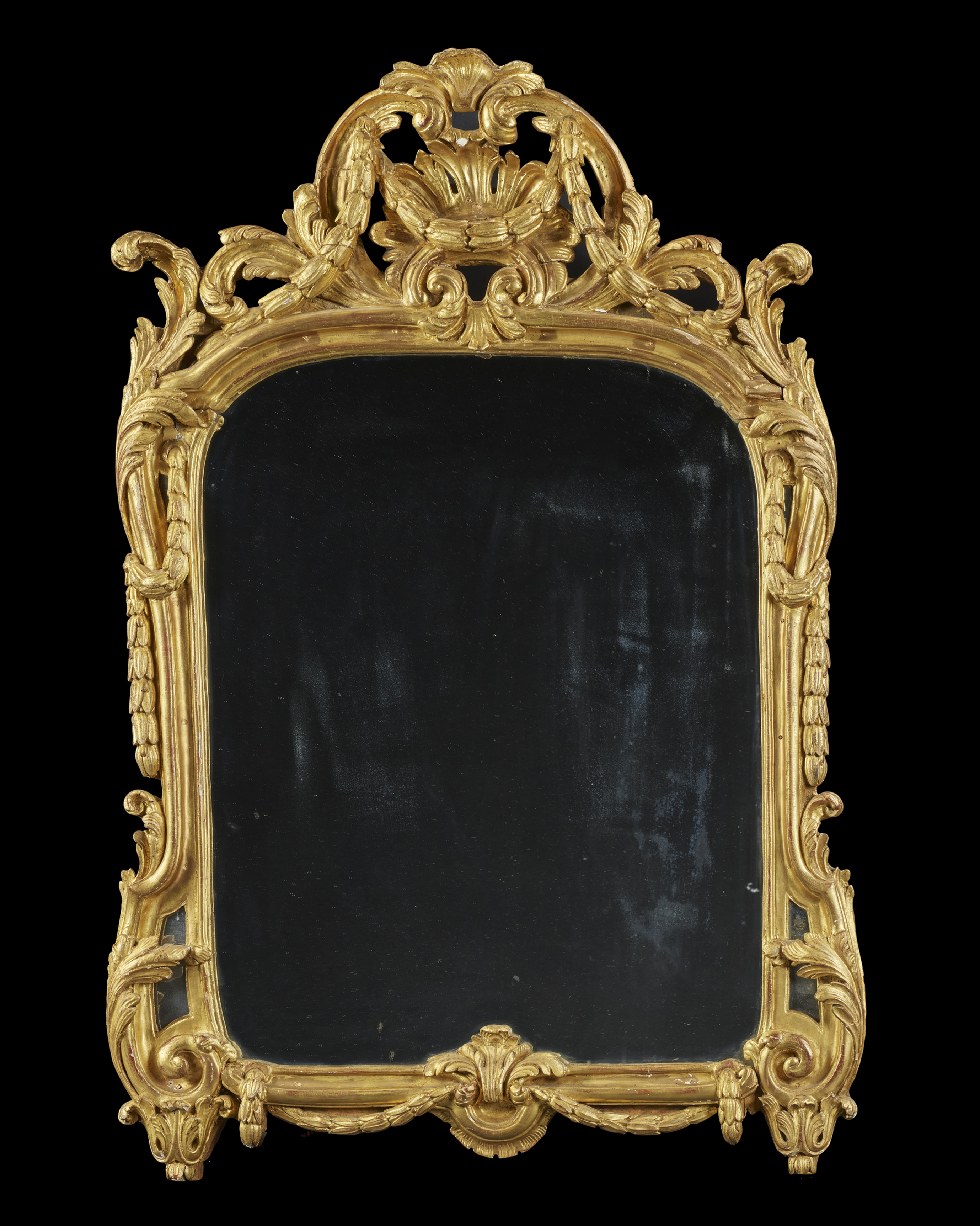 Lot 23: a French Rococo carved and pierced giltwood looking-glass with a mirrored border contained between two runs of shaped and cusped ribbon-bound fasces decorated with foliate scrolling and shell-like forms; the arched top decorated with a ovolo chain moulding and surmounted by an asymmetric cartouche set in a pierced rocaille and crowned with a pomegranate flower, with trails of smaller flowers descending on either side; the foliate scrolls ornamented with smaller pomegranate flowers and roses-à-tiges; the base with a pierced asymmetric rocaille and further flowers; the central mirrored plates later; 186 x 116 cm.; estimate: €3,000-5,000