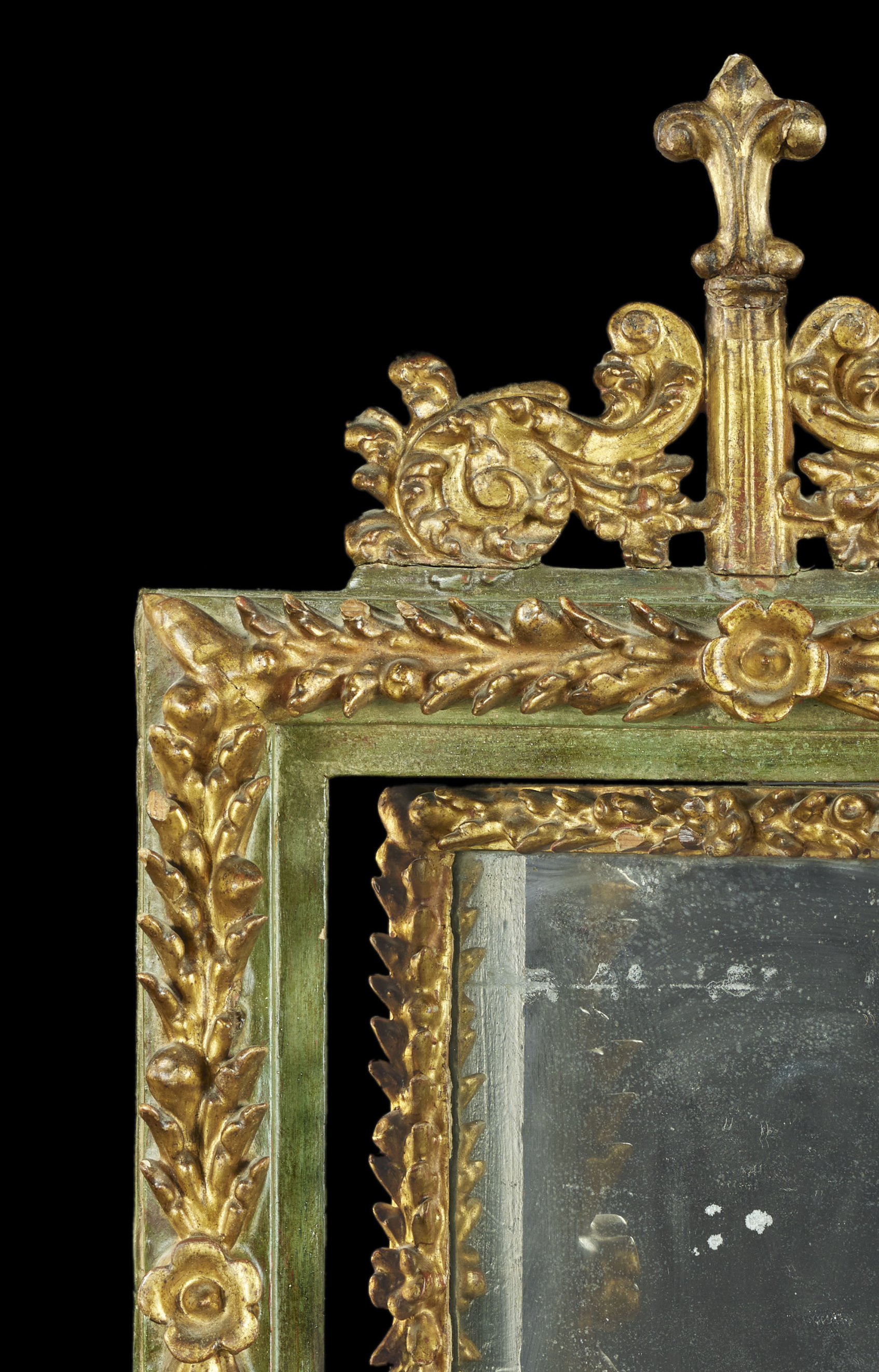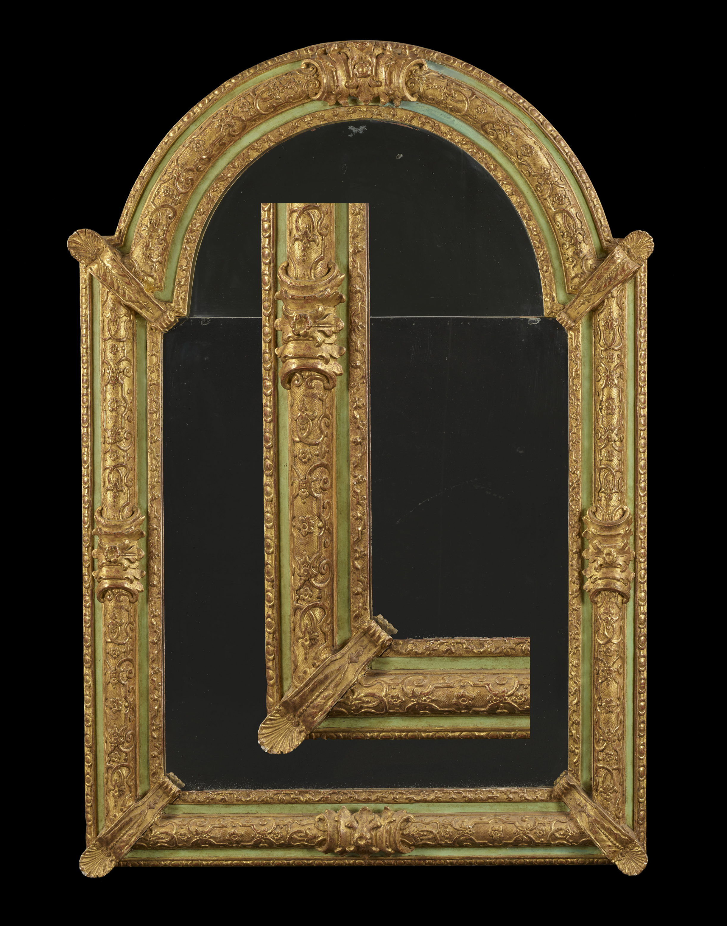 Lot 56: described as a French Régence looking-glass frame, this is more likely to be a Louis XIV updating of a Louis XIII pattern; an arched-top and shouldered picture frame for a sacred work, possibly a Crucifixion, and dating from the late 17thcentury; of carved giltwood with later mirrored plate, the green lacquered finish also possibly later, it has a torus profile with an ovolo chain at the back edge; the torus decorated with strapwork and flowers on a cross-hatched ground, and centred on each rail with scrolled, foliate and flowered clasps; with applied leaf-&-shell straps concealing the mitres; with undulating strapwork and leaf buds on a cross-hatched ground at the sight edge; 165 x 114 cm.; estimate: €4,000-6,000