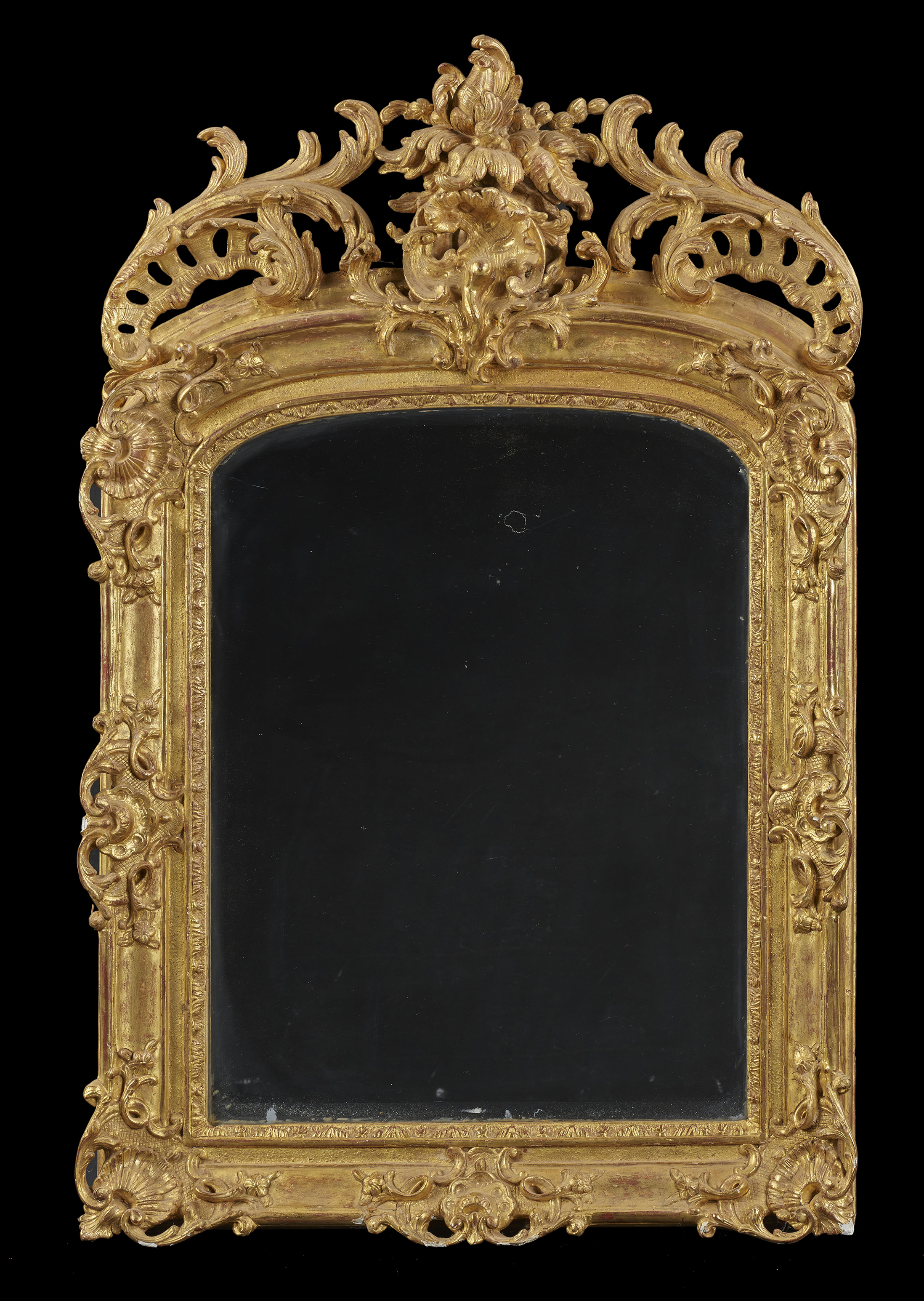 Lot 285: a late Louis XIV-Régence giltwood portrait frame converted into a looking-glass with a later mirrored plate; with convex top edge decorated with strapwork holding florets on a cross-hatched ground; a wide ogee with scrolling foliage, roses-à-tiges and miniature rinceaux connecting shell corners and reversed shell centres held in C-scrolled extensions of the top edge, and having respectively a hatched or a cross-hatched ground, and demi-centres with shaped foliate cartouches holding Eros’s quiver crossed with the burning torch of Love on a crossed-hatched ground, and terminating in a lily flower; sanded frieze; an ogee sight edge with acanthus leaves and buds; 144 x 121.5 cm.; estimate: €2,000-3,000