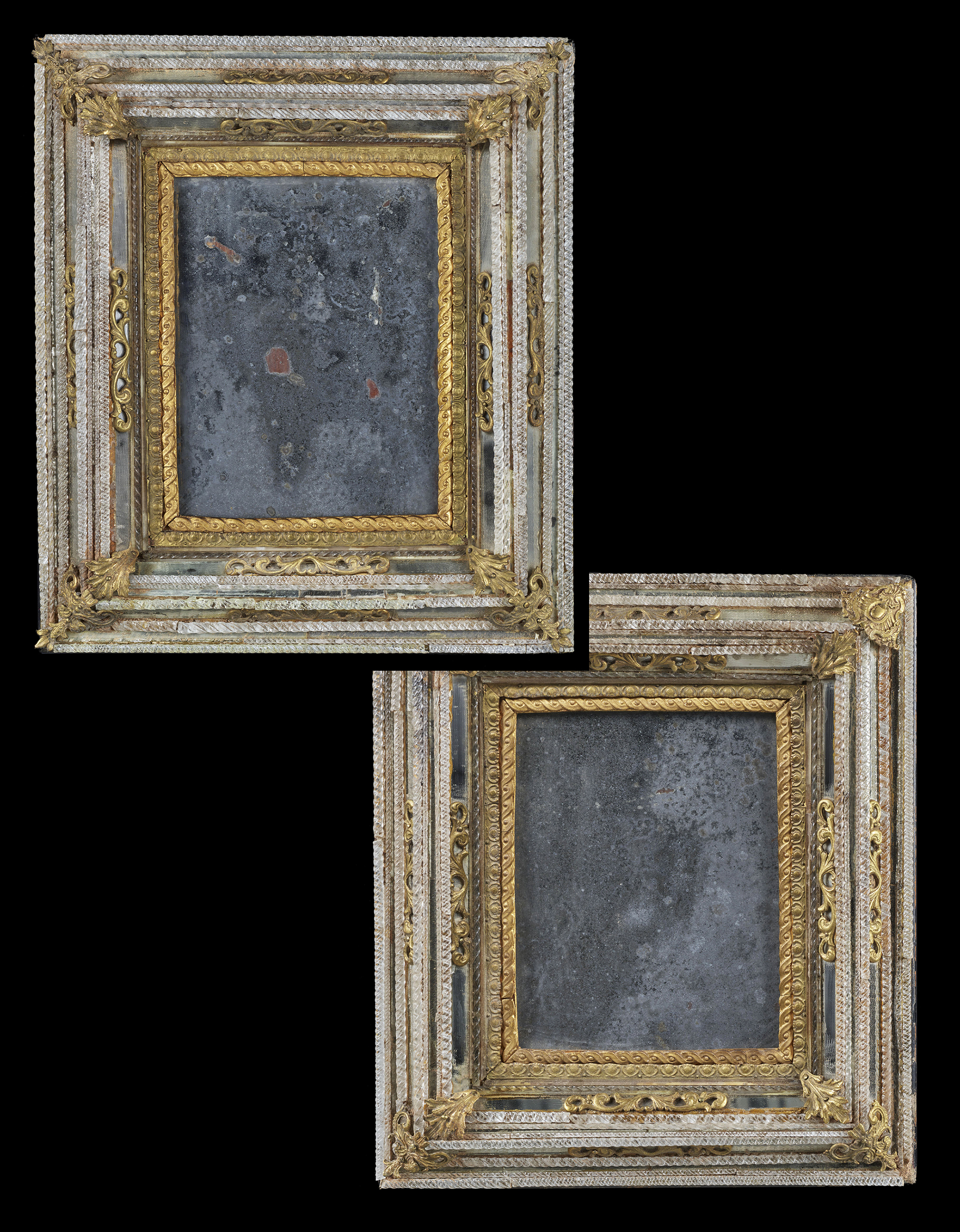 Lot 226: a pair of Italian looking-glasses; late 17th-18th century; ebonized wood mounted with verre églomisé, and decorated with repoussé brass and ormolu mouldings; ten orders of glass barley sugar twisted mouldings, brass ovolo chain and guilloche mouldings, with scrolling foliate centre appliqués, and acanthus leaf and scrolling foliate corner appliqués; 39 x 33 cm.; estimate: €6,000-8,000