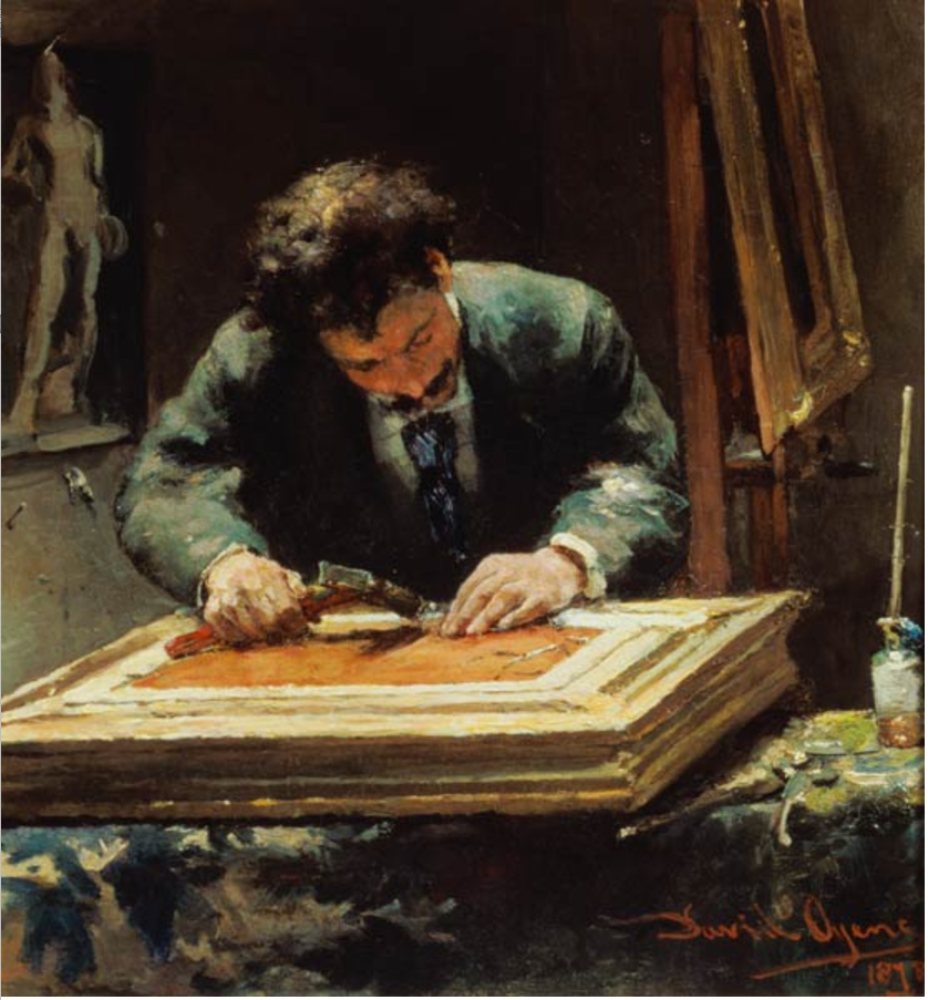 David Oyens (1842-1902), De lijstenmaker aan het werk (?Felix Mommens), 1871, Teylers Museum, Haarlem