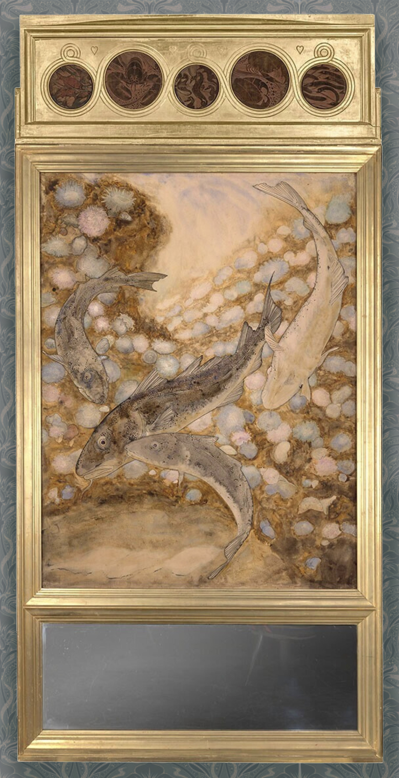 Gerrit Willem Dijsselhof (1866-1924), giltwood overmantel with Fish in a pool of sea anemones, watercolour, below decorative carved panel, and above a pane of mirrored glass, 1892, 250 x 120.5 x 7 cm., Museum Boijmans van Beuningen