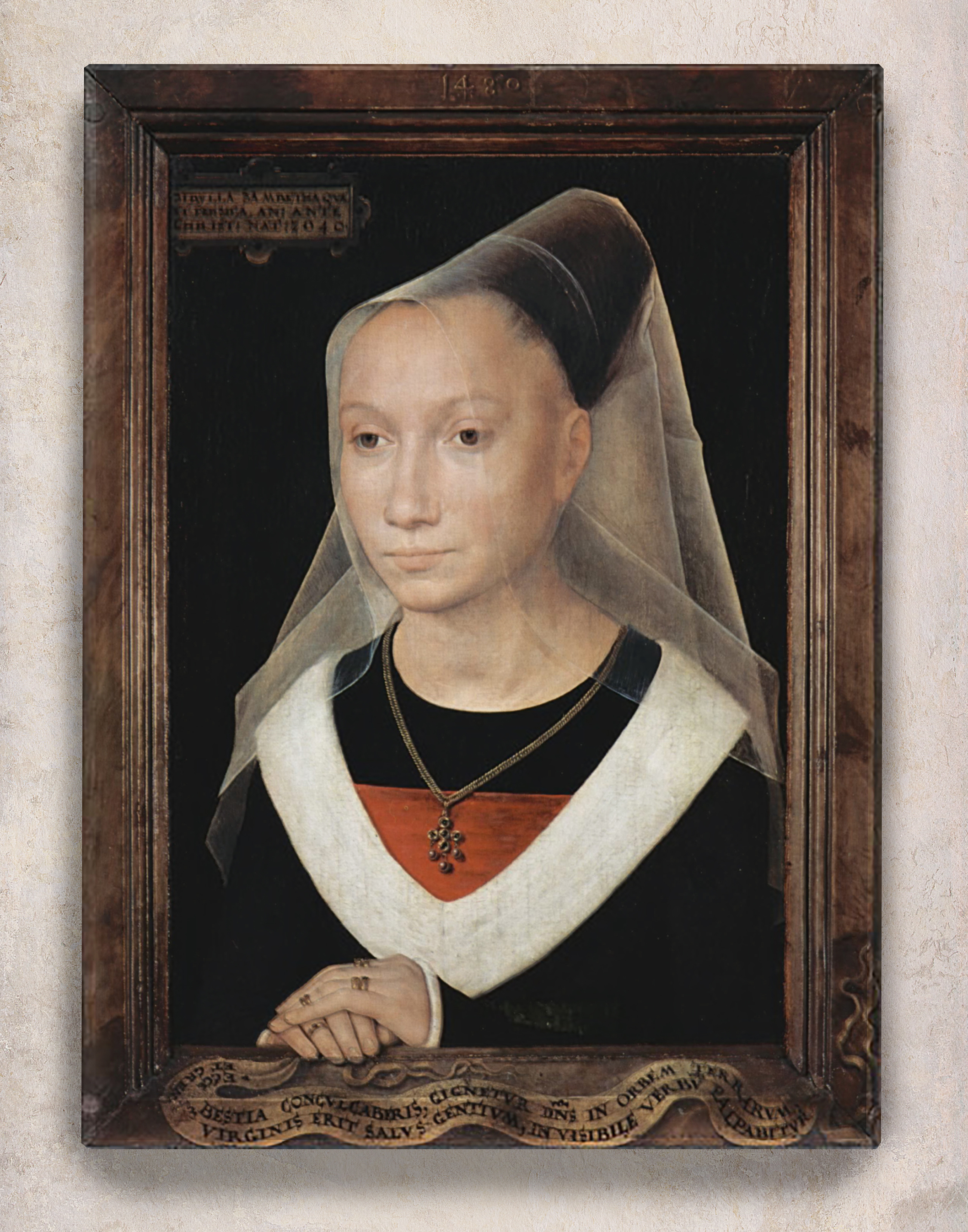 Hans Memling (c.1433-94), Portrait of a woman, 1480, panel, 38 x 26.5 cm., 46.6 x 35.2 cm. overall, Sint-Janshospitaal, Bruges