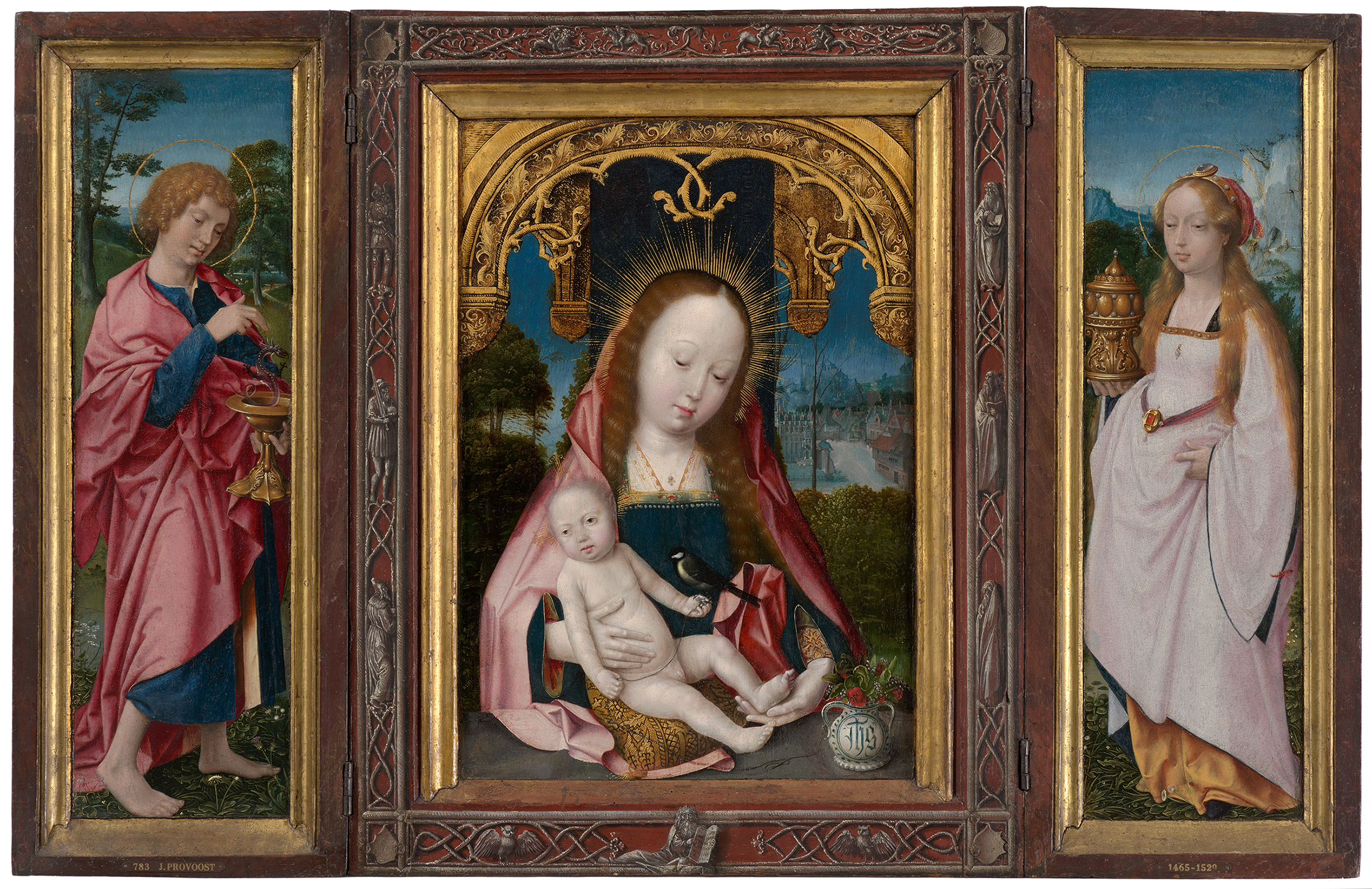 Jan Provoost (c.1464-1529), Triptych with the Madonna & Child, John the Evangelist & Mary Magdalene, c.1520-25, panel, 44 x 30.5 cm., Mauritshuis https://www.mauritshuis.nl/fr/decouvrir-la-collection/oeuvres-d-art/783-triptych-with-the-virgin-and-child-john-the-evangelist-and-mary-magdalene