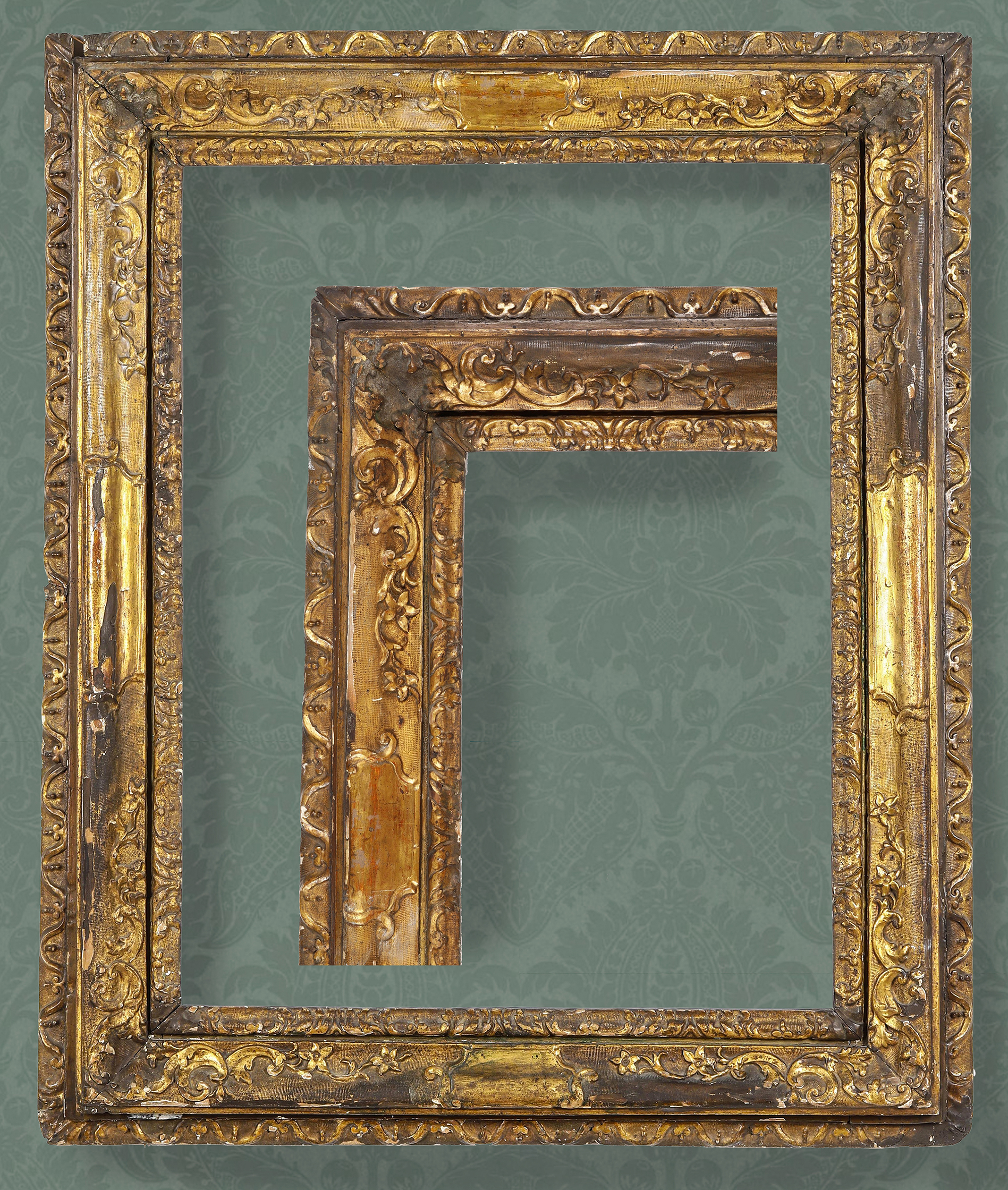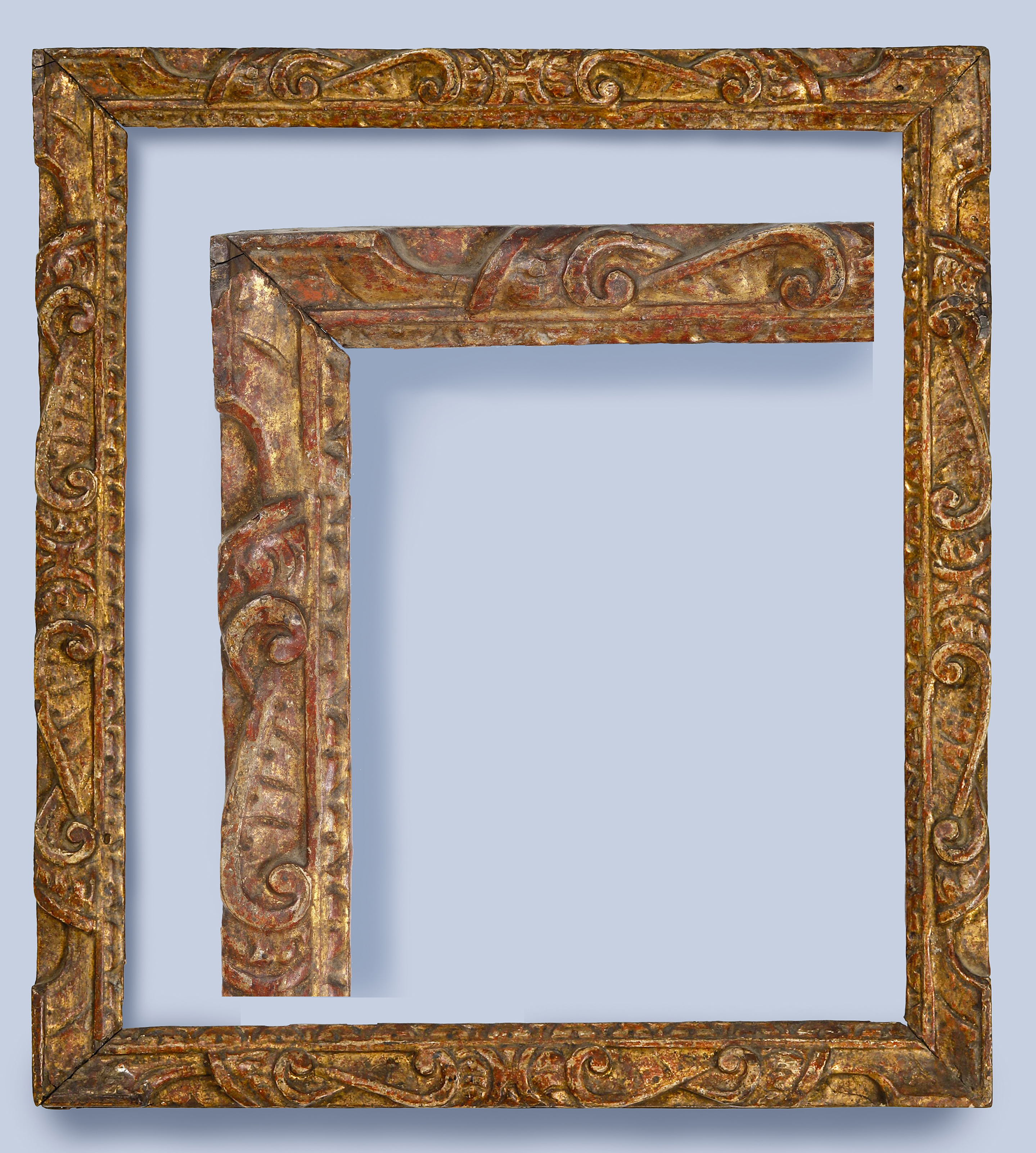 Lot 3: 16th century Italian frame in Sansovino style (possibly provincial?) in giltwood; slightly canted profile; roughly carved crossing scrolls, the flutes suggested; stylized and worn acanthus sight edge; antique hanger; 52.4 x 44.3 cm.; estimate: €1,500-2,000