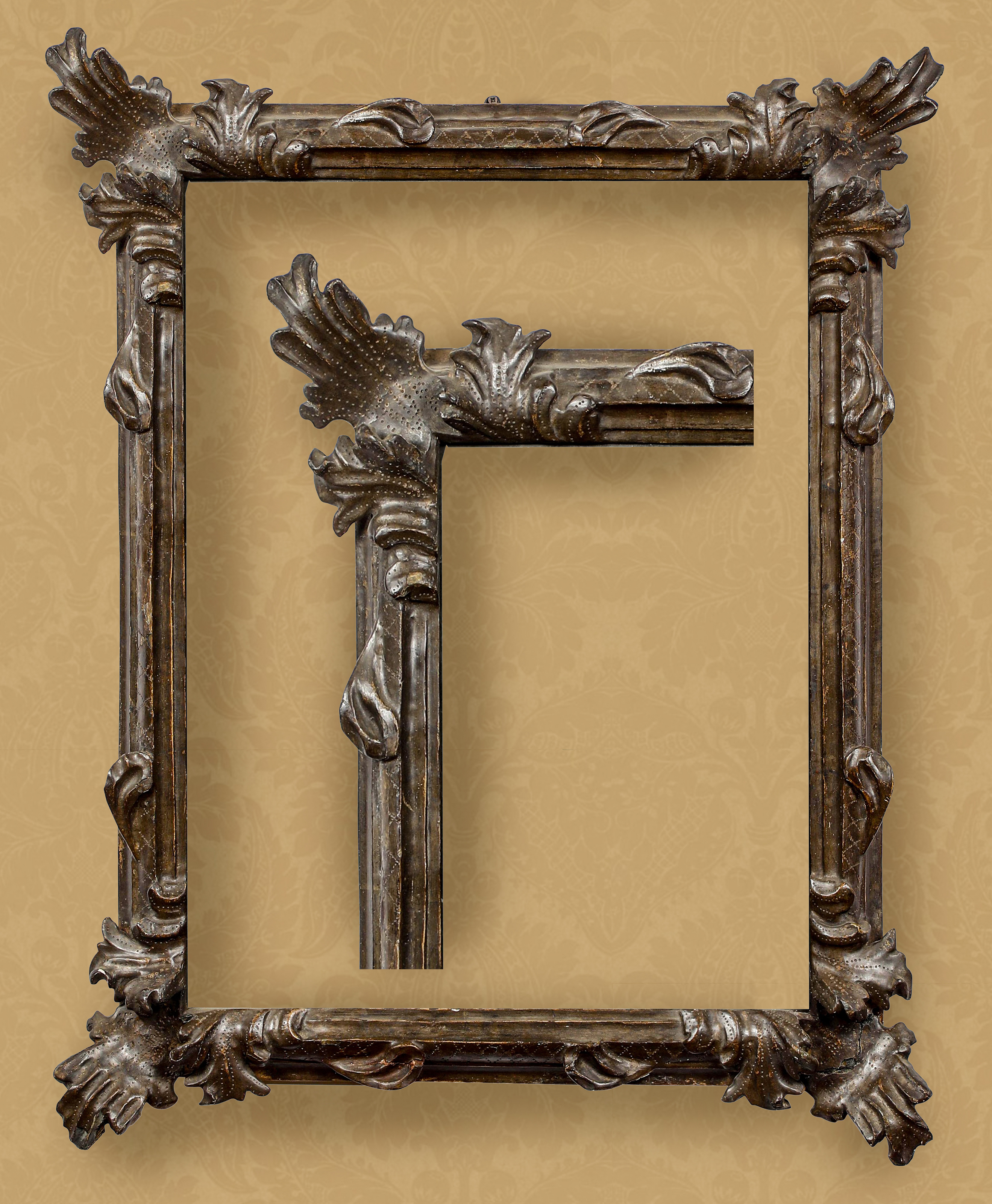 Lot 112: 18th century Baroque carved and lacquered silverleaf ‘mecca’ frame; with stepped concave moulding, the frieze positioned centrally at the top forward edge, with large projecting acanthus leaf corners flaring over the rail from the sight edge, and leaflets emerging in trompe l’oeil fashion from beneath, and curling over, the frieze; the acanthus leaves are veined in punchwork and the frieze has a punched diapered pattern; no photograph of reverse; 68.7 x 52 cm.; estimate: €1,200-1,500