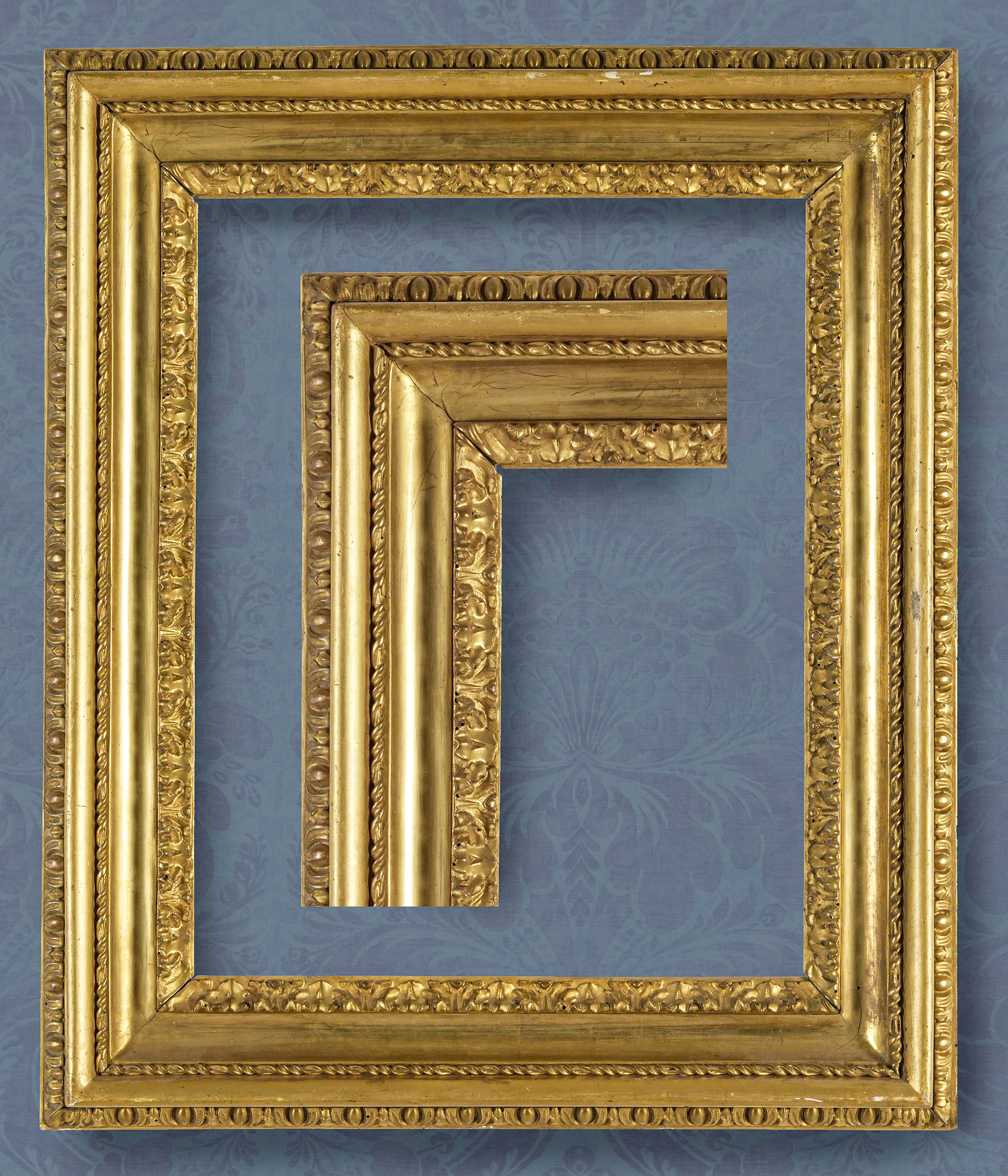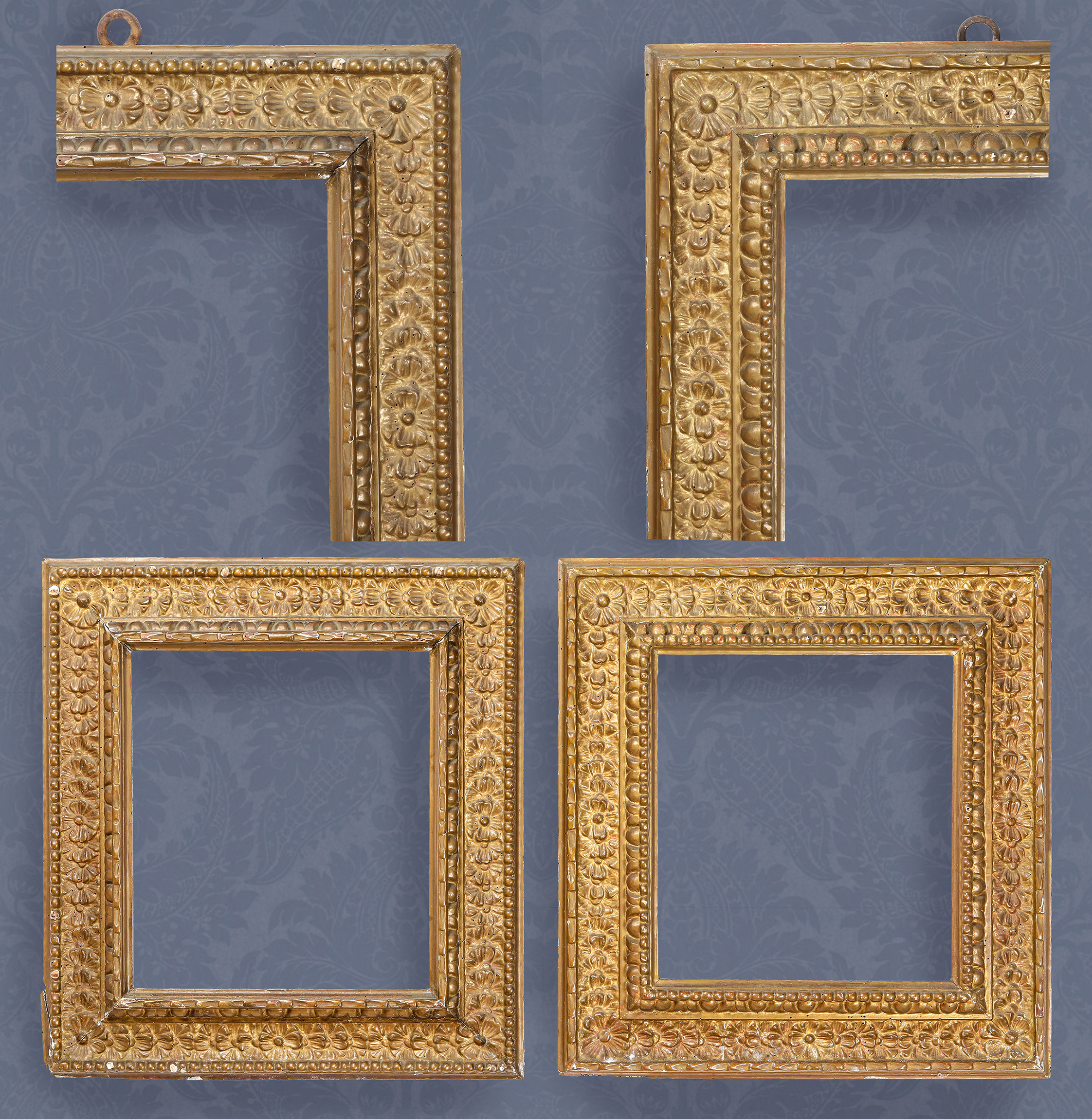 Lot 78: a pair of 18th century Baroque Italian reverse carved giltwood frames; beading at top edge; the frieze carved overall with a imbricated floral garland (probably of single roses) where the flowers flow from corner to centre and from centre to corner, meeting at the demi-centres of each rail; egg-&-dart rising to the top edge with (on one frame) a stylized running leaf at the top/sight edge and (on the other frame) beading. The roses may indicate that these frames originally held painting concerning the Madonna – for example, the Virgin Annunciate and Angel, the Mater Dolorosa and an Ecce Homo – or perhaps two female saints; or they may have held secular female portraits. 38 x 33 cm. each; antique hangers: estimate: €1,000-1,500