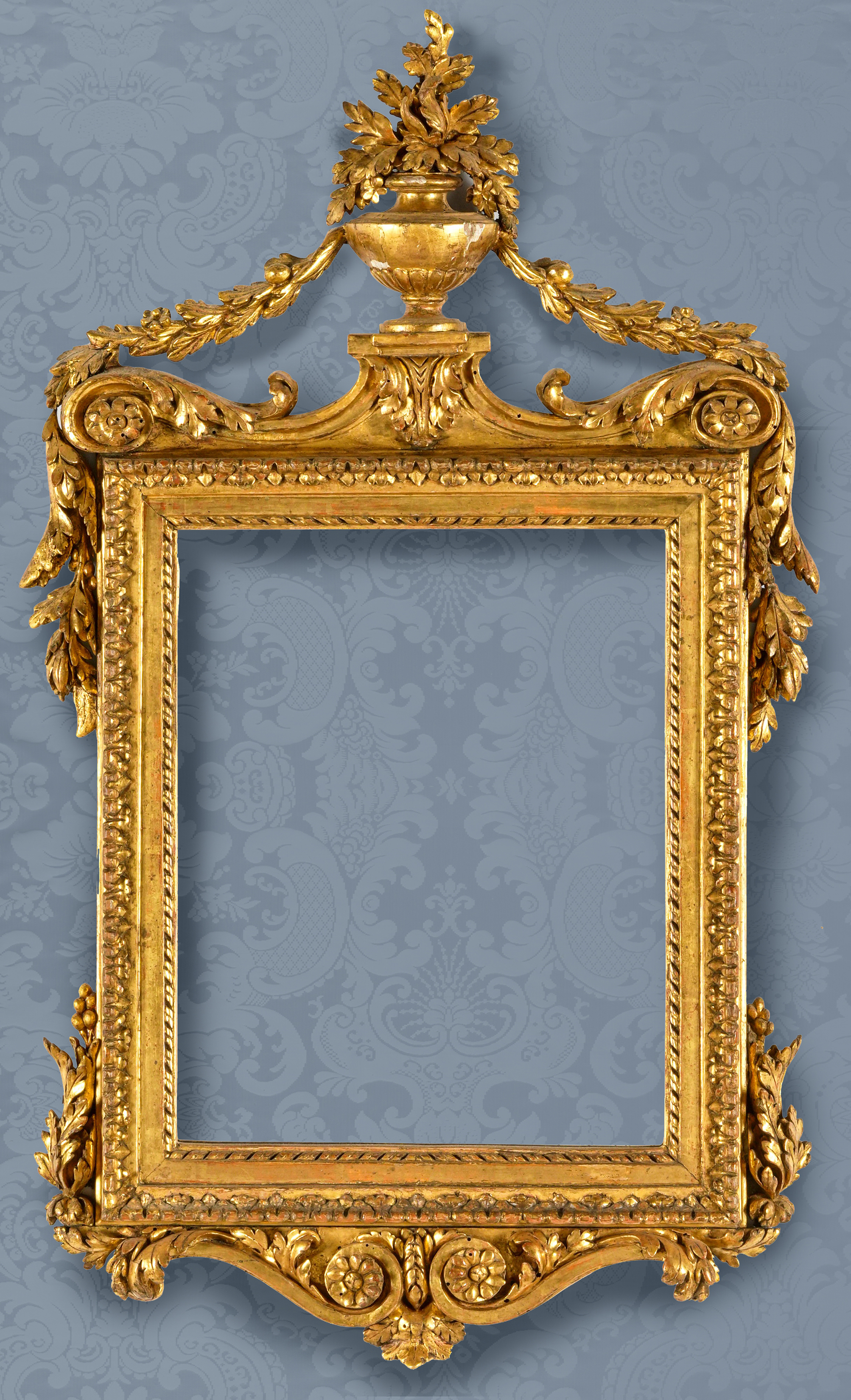 Lot 162: 18th century NeoClassical carved giltwood fronton frame, possibly north Italian (described at Genoese), with architrave profile; acanthus leaf-&-dart; spiral ribbon sight edge, centred on the short sides; with reversed swan’s neck pediment with acanthus leaf and rosette scrolls after the Antique, and an acanthus leaf plinth supporting an urn from which spring an asymmetric leafy flourish at the crest and festoons of leaves and flowers which depend on either side of the frame; and with a matching apron of acanthus leaf and rosette scrolls, with leaves and buds springing up the lateral rails; antique hanger, with possible evidence of an earlier hanger?; 31 x 24.5 cm.; estimate: €1,000-1,200
