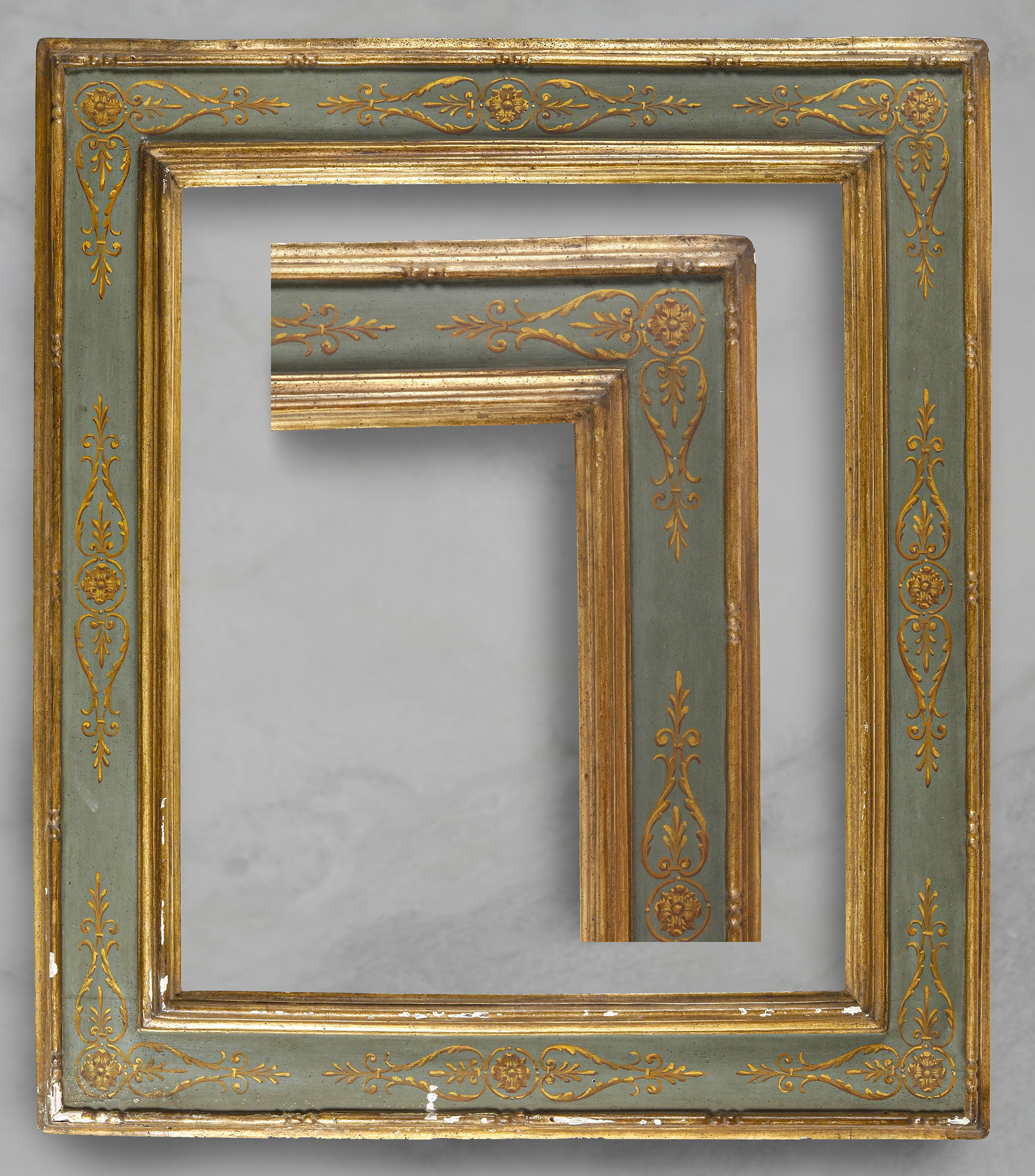 Lot 180: 17th-18th century Italian parcel-gilt and polychromed cassetta; entablature profile, with astragal-&-double bead; wide frieze in celadon green, with trompe l’oeil arabesques and rosettes painted in shades of ochre, soft yellow and dark brown at the corners and centres; stepped convex and concave mouldings to the sight edge; antique hanger; 80 x 66 cm.; estimate: €800-1,200