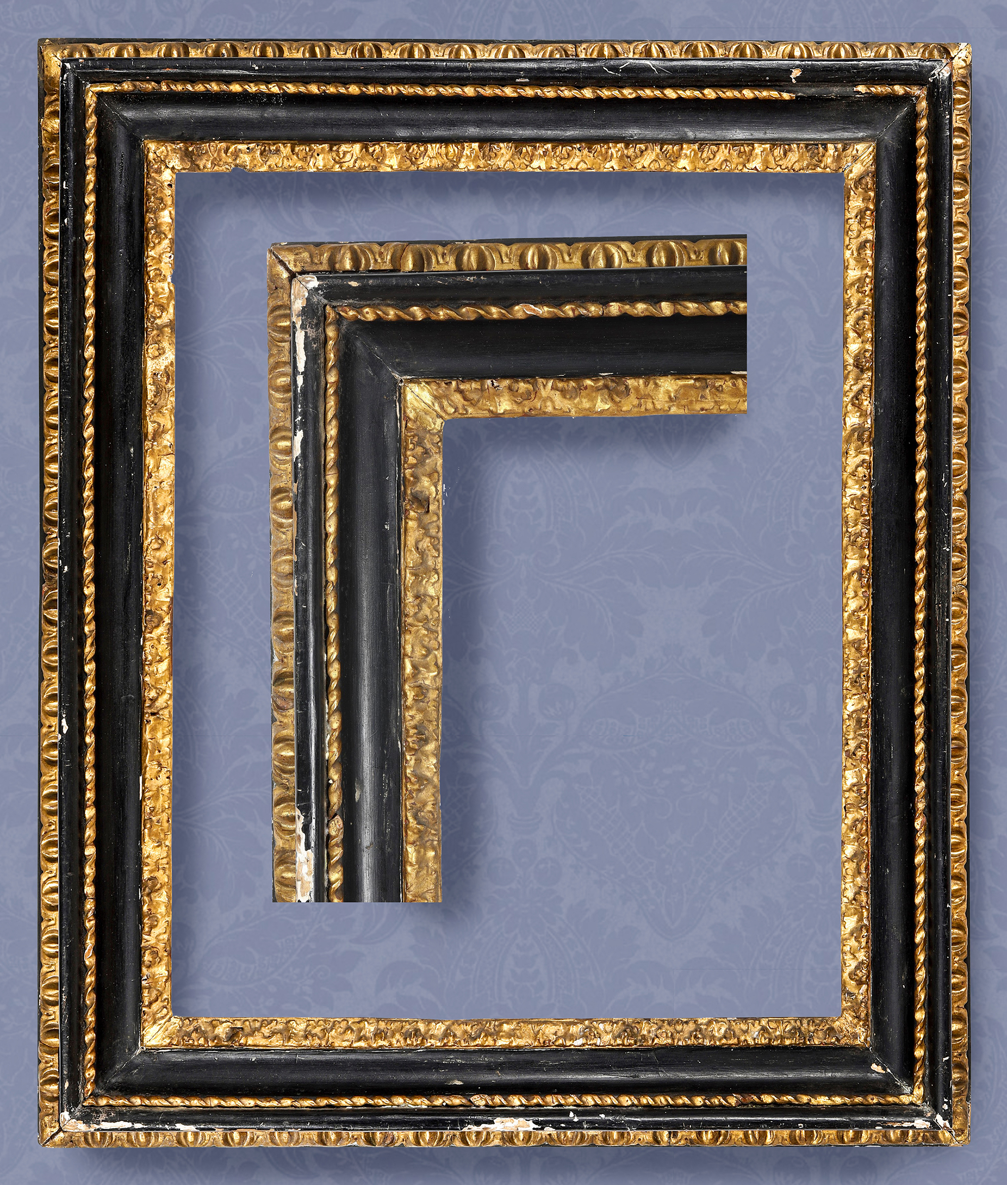 Lot 190: 18th century Baroque Italian (Roman) carved and parcel-gilt Carlo Maratta frame with hollow profile; with egg-&-dart at the back edge; applied carved spiral ribbon moulding beneath the convex top edge; double acanthus leaf-tip at the sight edge; ebonized, polished and picked out in gilding; evidence of hanging on the short side; 61 x 48.5 cm.; estimate: €800-1,200