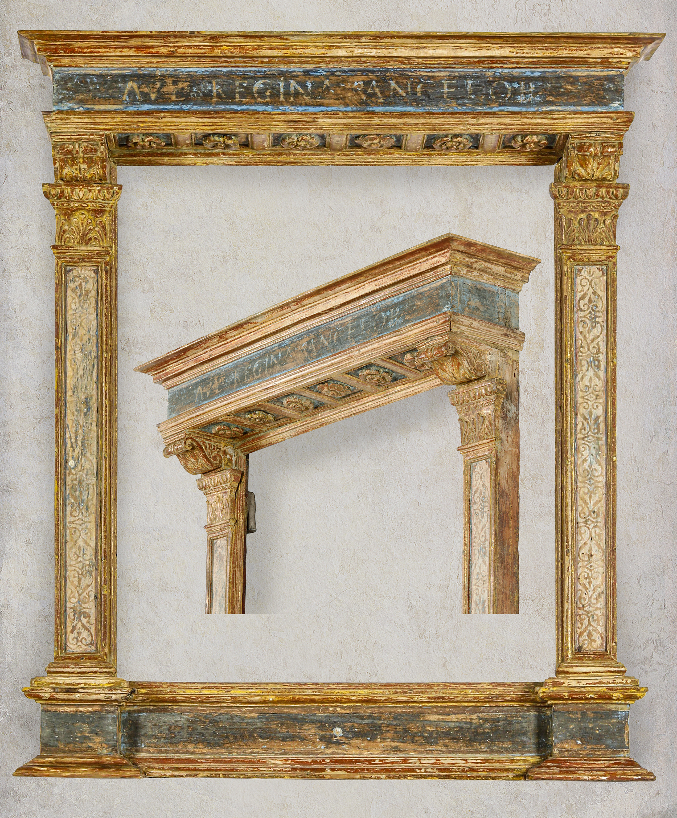 Lot 11: 16th century Italian aedicular frame with coffered canopy in carved and polychromed giltwood; the entablature supported by pilasters having a cream frieze decorated with arabesques, and capitals with palmettes and egg-&-dart, and bearing leafy modillions beneath the cornice; the coffers of the canopy with a blue ground holding six different rosettes, carved in relief; the frieze of the entablature also painted blue and inscribed ‘AVE REGINA ANGELORUM’, a contraction of the antiphon for the Virgin Mary, ‘Ave regina caelorum,/ Ave domina angelorum’ (Hail, Queen of Heaven,/ Hail, Mistress of angels’), which dates from the 12th century. It became topical from 1569, when Pope Pius V laid down its use at compline from February to Easter; this may have a bearing both on the date of the frame and the subject of the painting it originally held. The frieze of the predella panel was also once inscribed, but is now unreadable (in the photographs) save for a single ‘O’. Overall measurements: 103 x 88 cm., sight: 72.4 x 60 cm.; estimate: €4,000-5,000