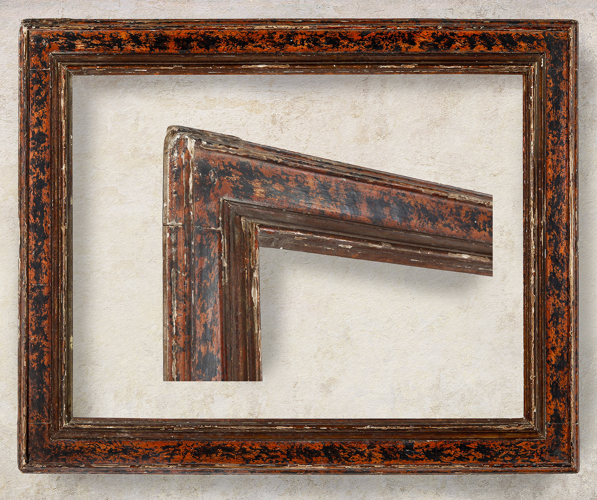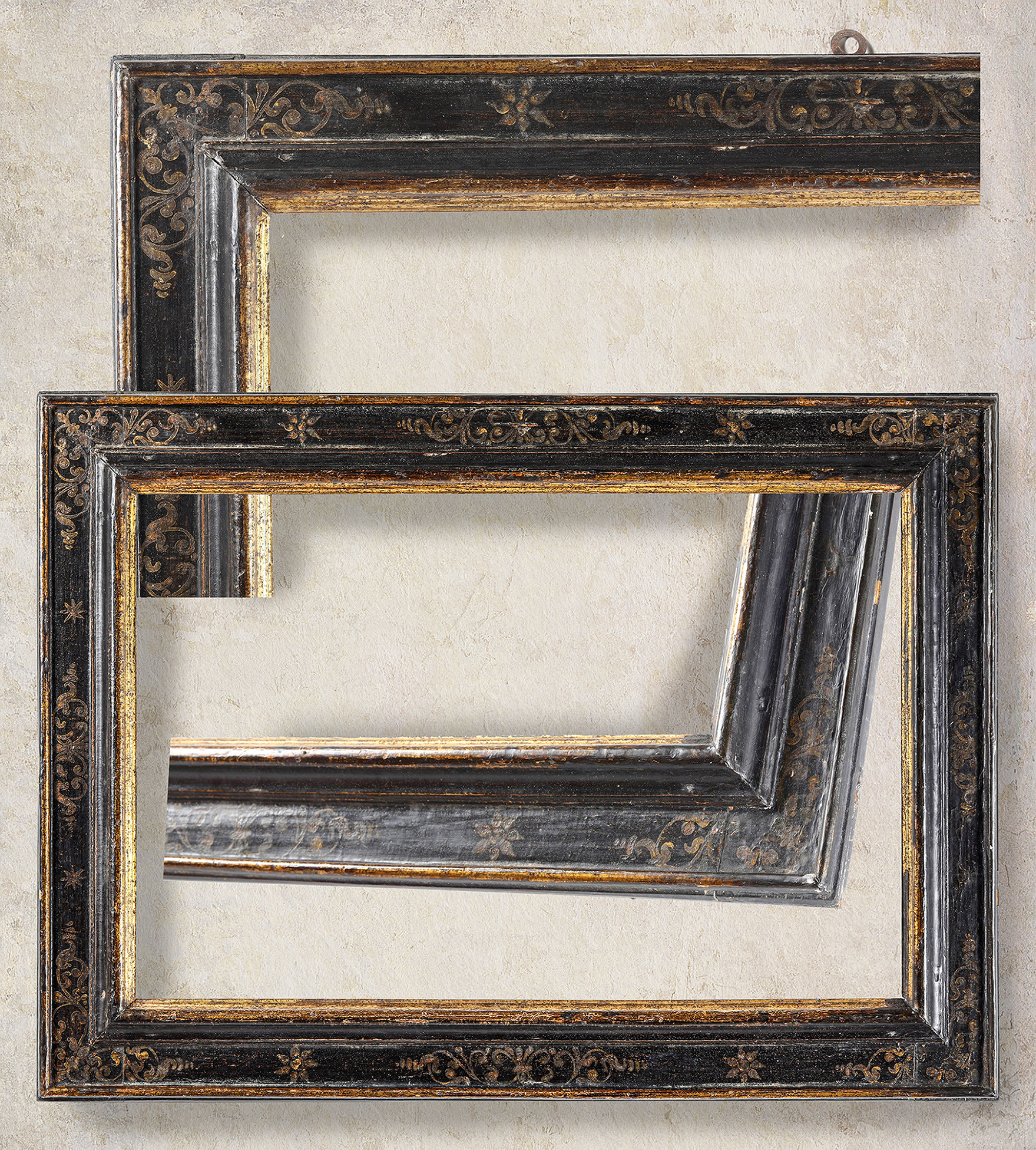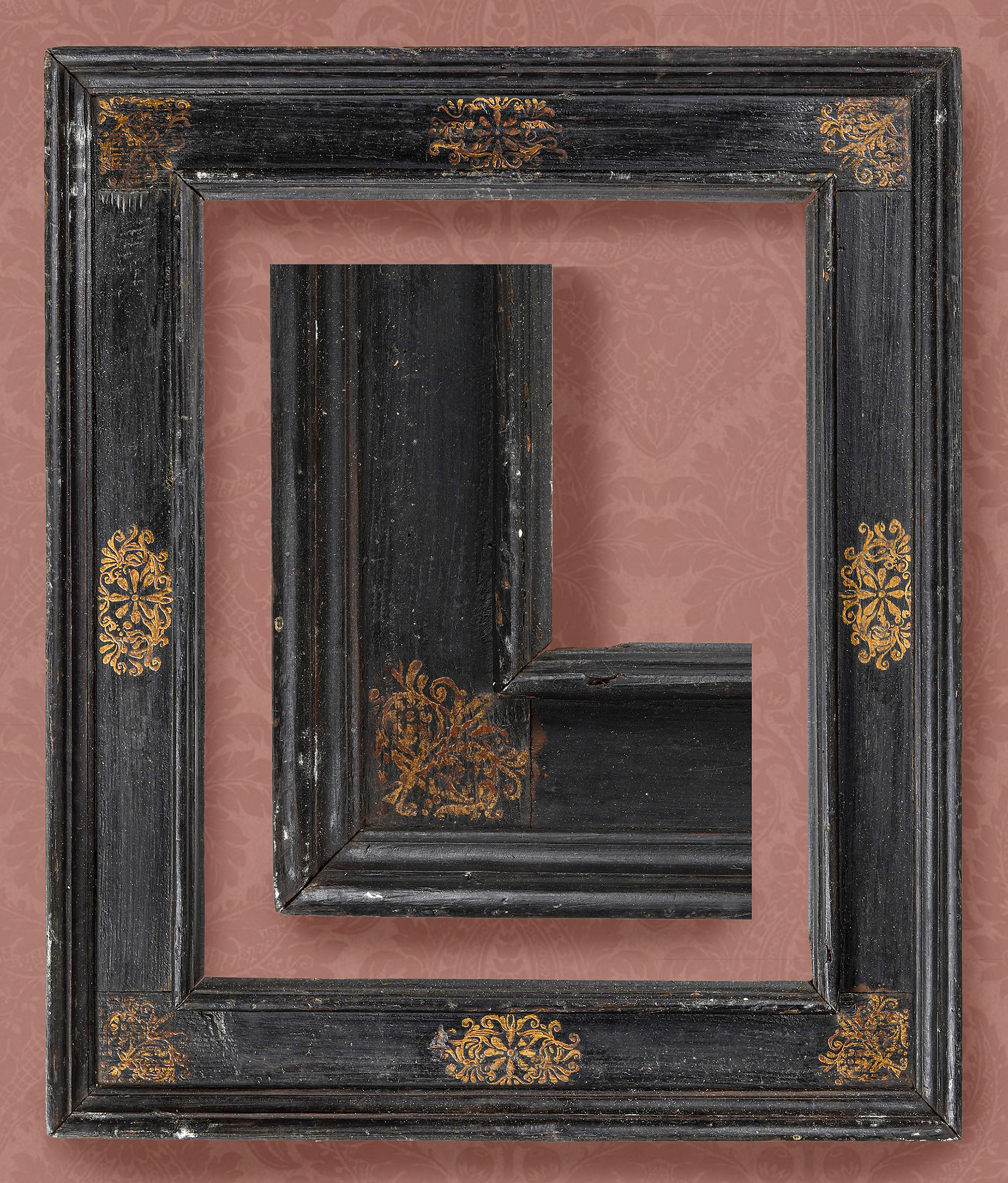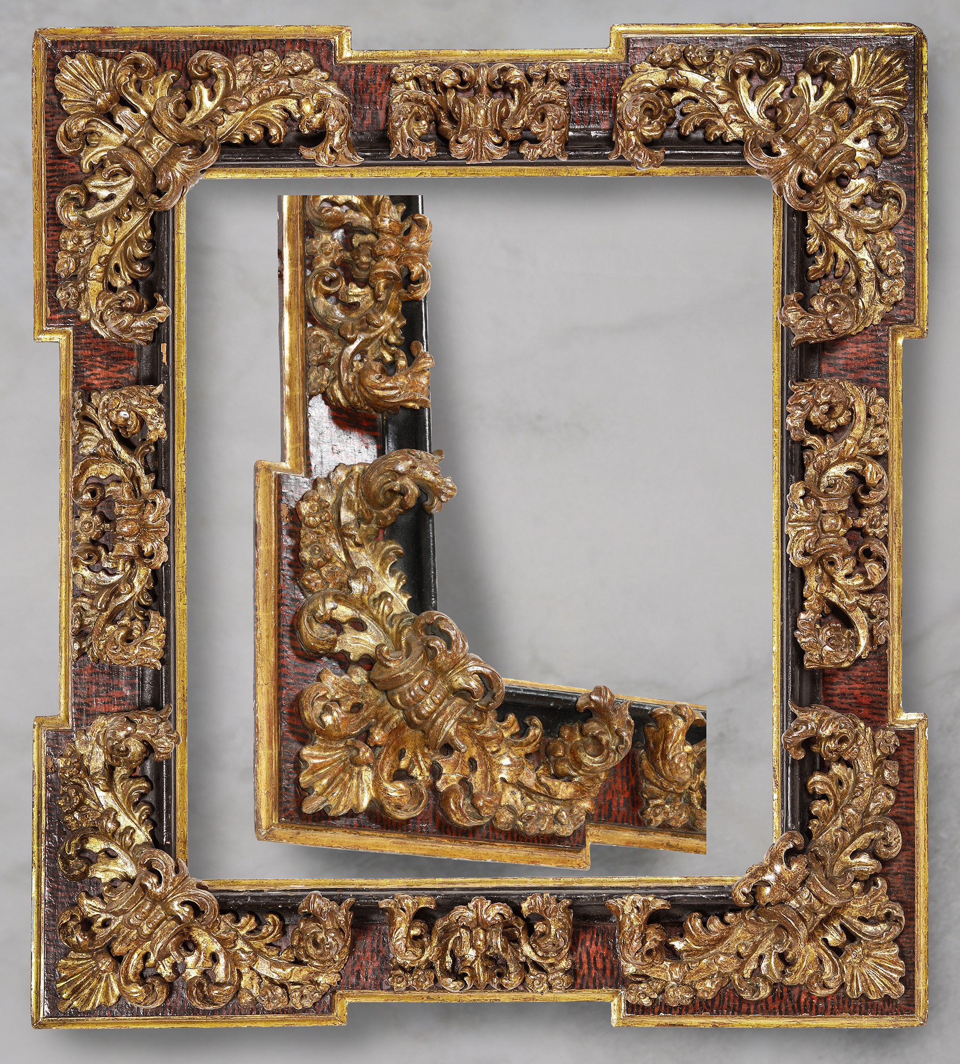 Lot 65: 17th century Baroque Spanish reverse carved parcel-gilt and polychromed frame with outset corners; small concave mouldings at back and sight edges; deep ebonized ogee rising to the top/ sight edge; the frieze painted with a faux tortoiseshell (tiger-striped) effect, possibly over a gilded ground (or with a red lacquer on the gesso ground); ornamented with applied deep relief carved giltwood scrolling acanthus leaf and floret clasps across the width of the frame at corners and centres, the corners with scallop shells; antique hanger; 94 x 78.7 cm., estimate: €3,200-4,000