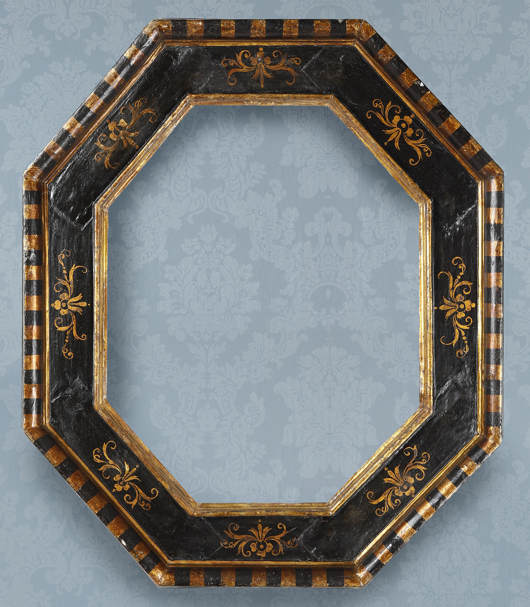 Lot 33: 17th century, probably Sienese, ebonized and parcel-gilt octagonal frame in portrait orientation, with torus, striped in black and gold, at top edge; the frieze with cursive, scrolling lilies in mordant gilding; overall: 104 x 89 cm., sight: 72 x 58 cm.; estimate: €1,000-1,200