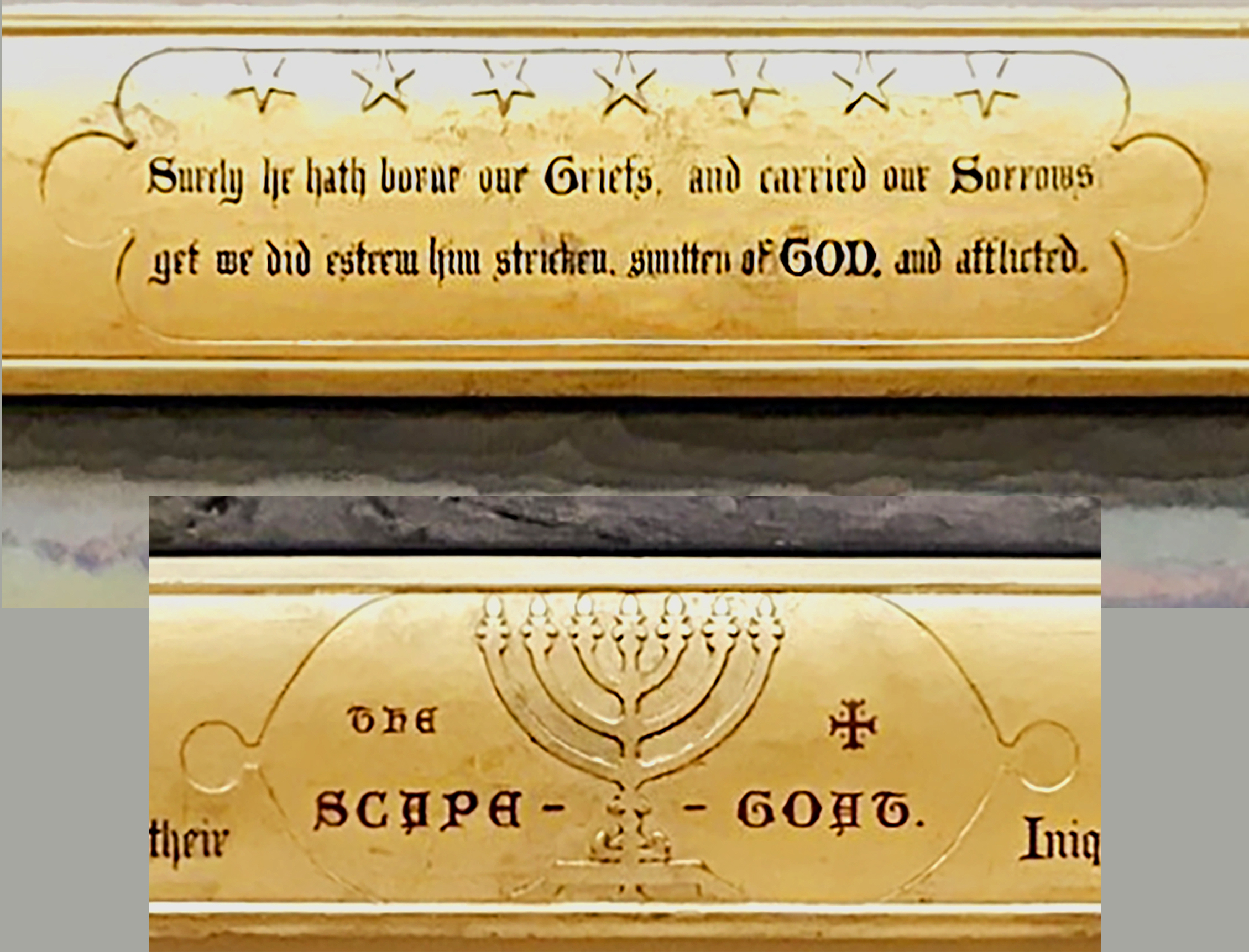 These motifs are designed to support the Old Testament subject of the painting, but intriguingly they also work to expand upon the image itself by alluding to events in the New Testament (none of which appear in the painting). So the shaped panel at the top, decorated with seven stars, uses a Biblical quotation to link the scapegoat to Christ: