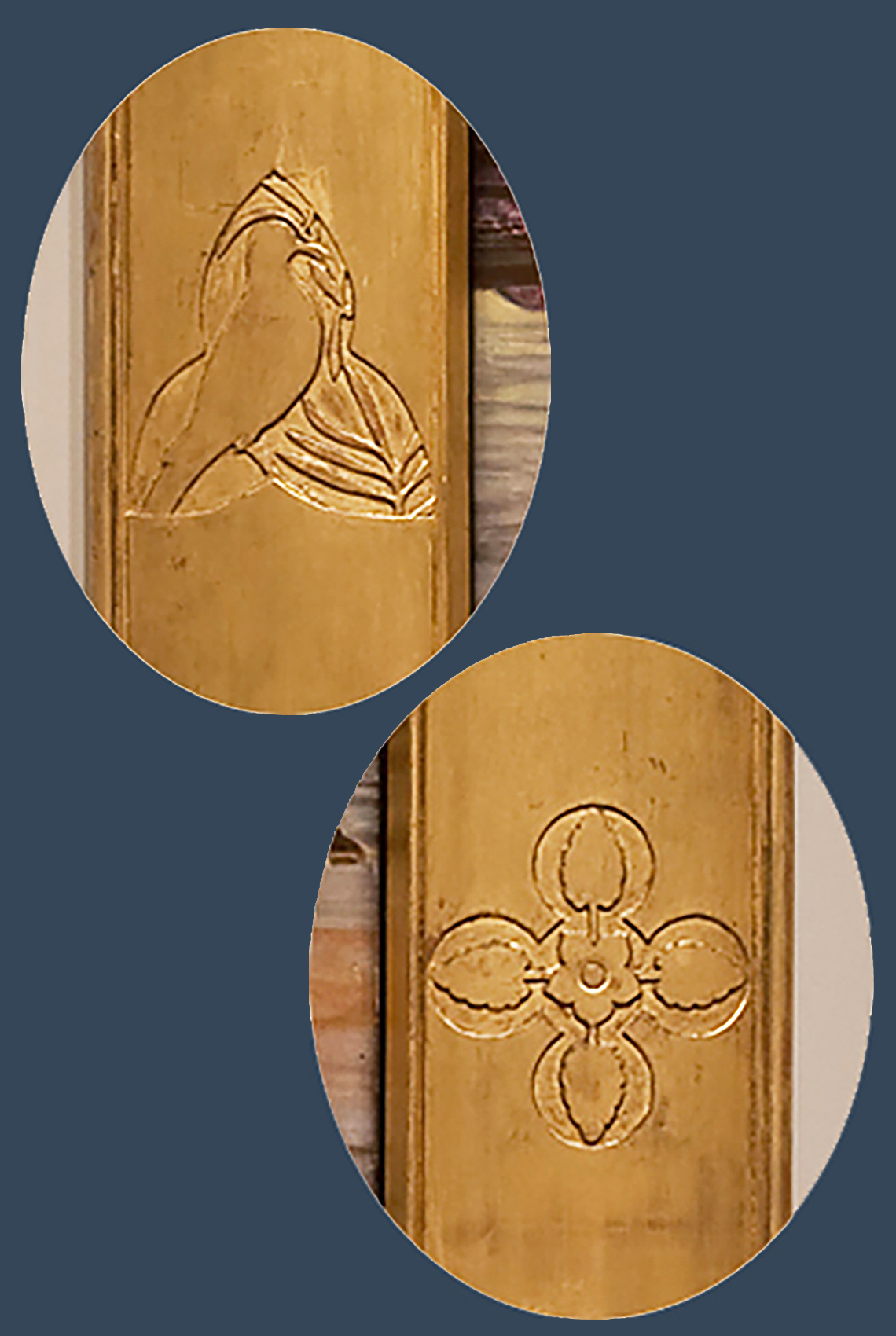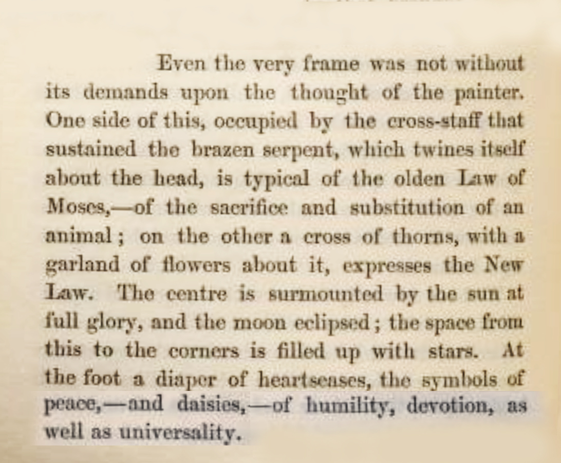 On the right-hand vertical rail, a cruciform sprig of stylized heartsease decorates the central panel; this is a variety of wild pansy, or love-lies-bleeding, and links the pain of living with the love of Christ. On the left-hand side a dove with an olive branch is carved into a trefoil, uniting the symbol of peace with that of the Trinity. Without its frame the painting is a depiction of unrelieved suffering and despair, whilst united with it – as a complete artwork – it conveys spiritual hope along with the redemptive power of Christ.