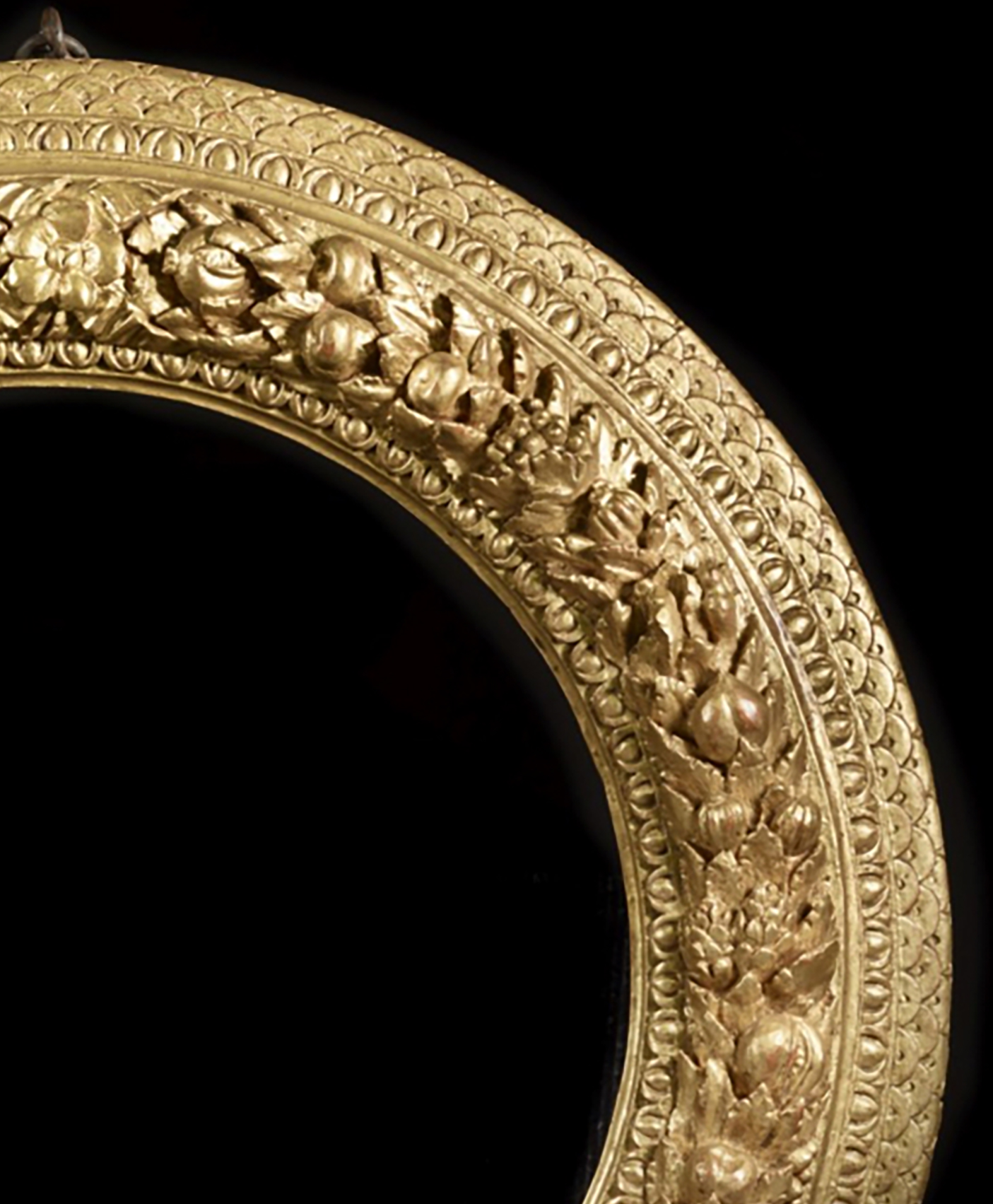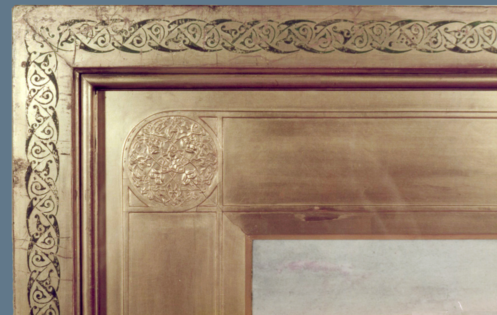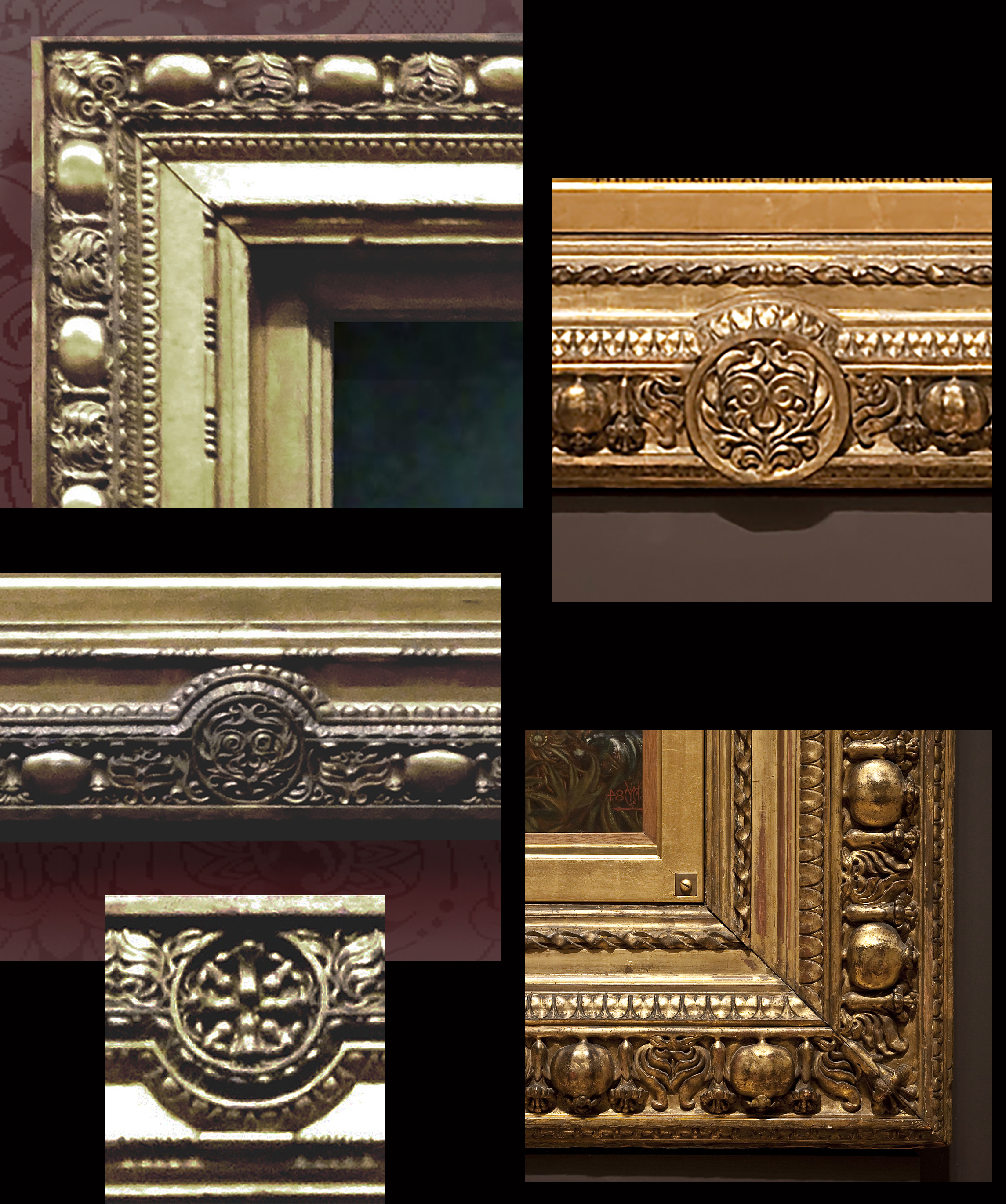 He had a seemingly limitless inventive capacity for clothing his work in an astonishingly varied array of frames – carved in wood, carved in shallow relief in the gesso, inlaid with bone, covered in applied composition ornament to his own design, carved in shallow relief and painted naturalistically, or stencilled – and continued to produce innovatory settings over a period of more than fifty years without any slackening of his imaginative flair.