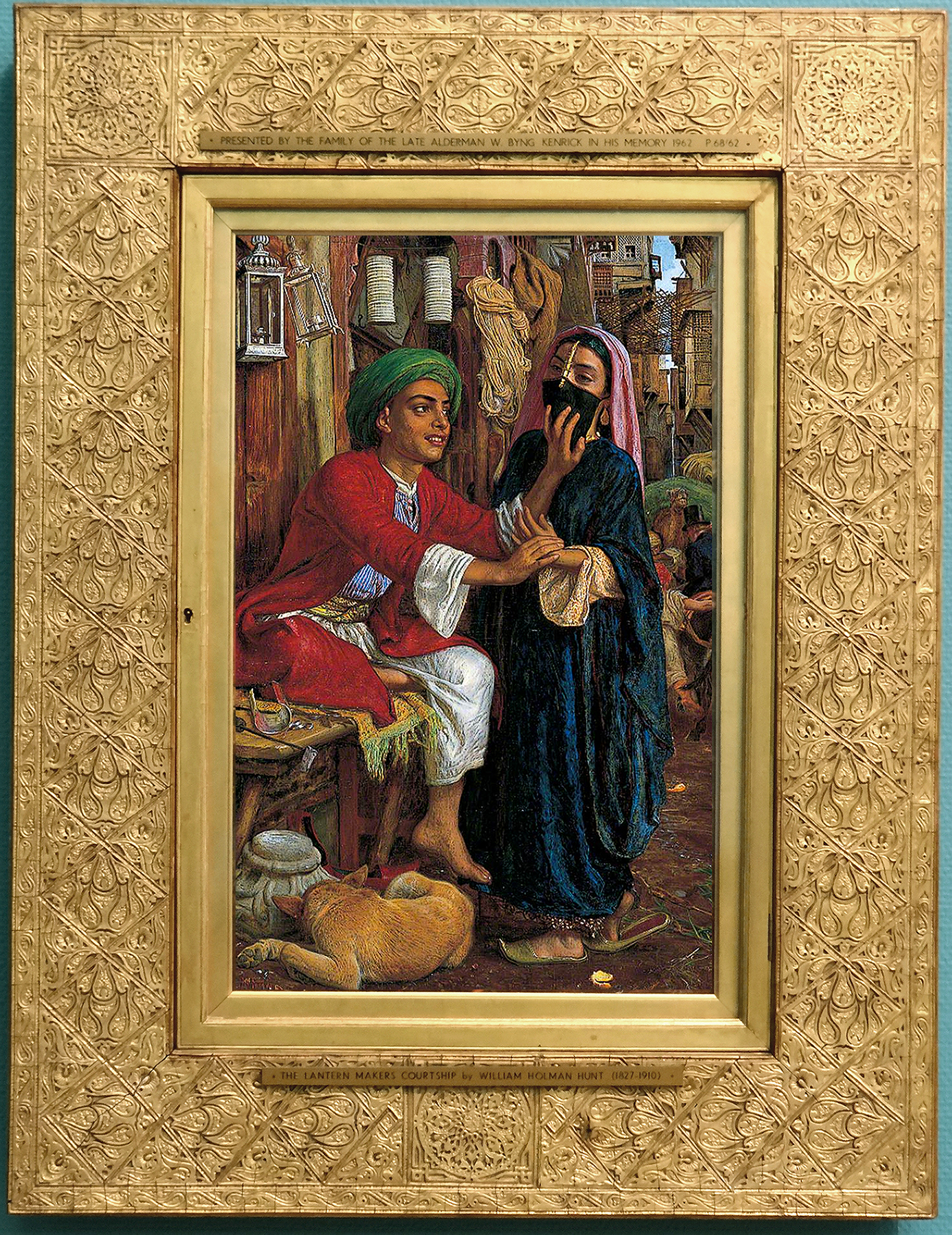 There are other motifs on his frames which must also have been taken directly from The grammar of ornament. The lanternmaker’s courtship (1854-61, Birmingham MAG) makes a spectacularly good use of cast compo (composition ornament), which covers the whole width of the flat rail in a shallow relief gilded moulding; the circular motifs in the top corners and bottom centre reproduce the medallion in ‘Arabian No 5’, whilst the frieze ornament comes from the central panel of ‘Arabian No 2’. Copying these motifs, even moulded in compo rather than carved in wood, required expense, dedication, and a very good framemaker, since the moulds themselves were, at that time, made of boxwood – a very hard, close-grained wood, into which every ornament had to be carved by hand, in reverse. Once done, the mould could be used again and again, which is why the ‘Arabian No 5’ medallion appears so often on Hunt’s frames; it was an investment which he could turn to whenever he wanted a decoration for the frame of an Arabic, Palestinian or other Near Eastern subject.