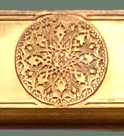The interlaced ornament which defines the inner and outer contours of the frieze with its arched top, is also taken from Jones – more specifically from his ‘Arabian No 4’, as noted on Hunt’s drawing for the frame. The arched structure, based on a page of the Qur’an, has been adapted to the double border of the wooden frame, and the top has been stretched laterally and softened into a cusped form of round arch, creating a doorway like some of the carved stone entrances he sketched on his travels through the Holy Land.