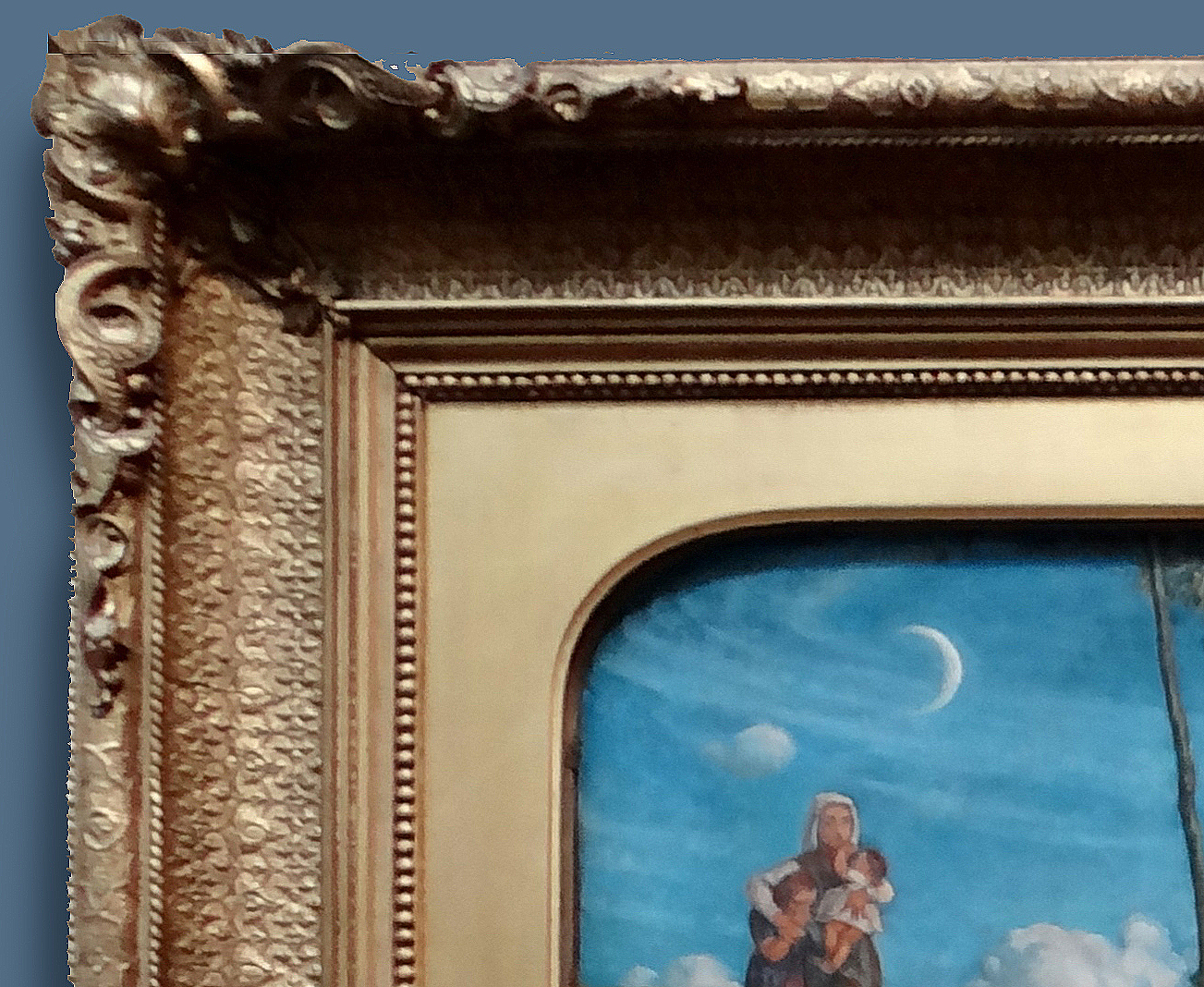 Millais’s design for Convent thoughts is outrageously modernizing compared with the frame used for his Isabella, a couple of years earlier. This is very similar to the frame of Hunt’s contemporary painting Rienzi, above: a Victorian stock frame, bought off the peg, with a round top edge and deep scotia or hollow decorated with shallow impressed patterns cast in composition (‘compo’). It is basically a commercial revival of an 18th century French Baroque style, with a machine-cut wooden moulding where none of the ornament – even the raised corners – needed to be hand-carved; the sort of conventional mid-19th century frame an artist would use when submitting work to the Royal Academy or to other public exhibitions.